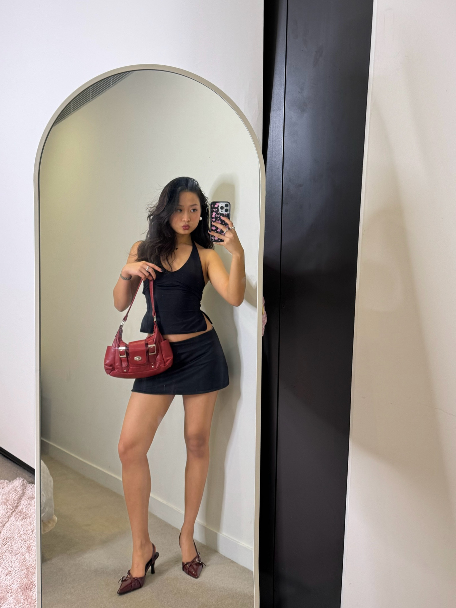 I love how the black top and mini skirt create a sleek, monochromatic base that elongates the silhouette. The pop of color from the red bag and matching shoes adds a chic and cohesive finishing touch.