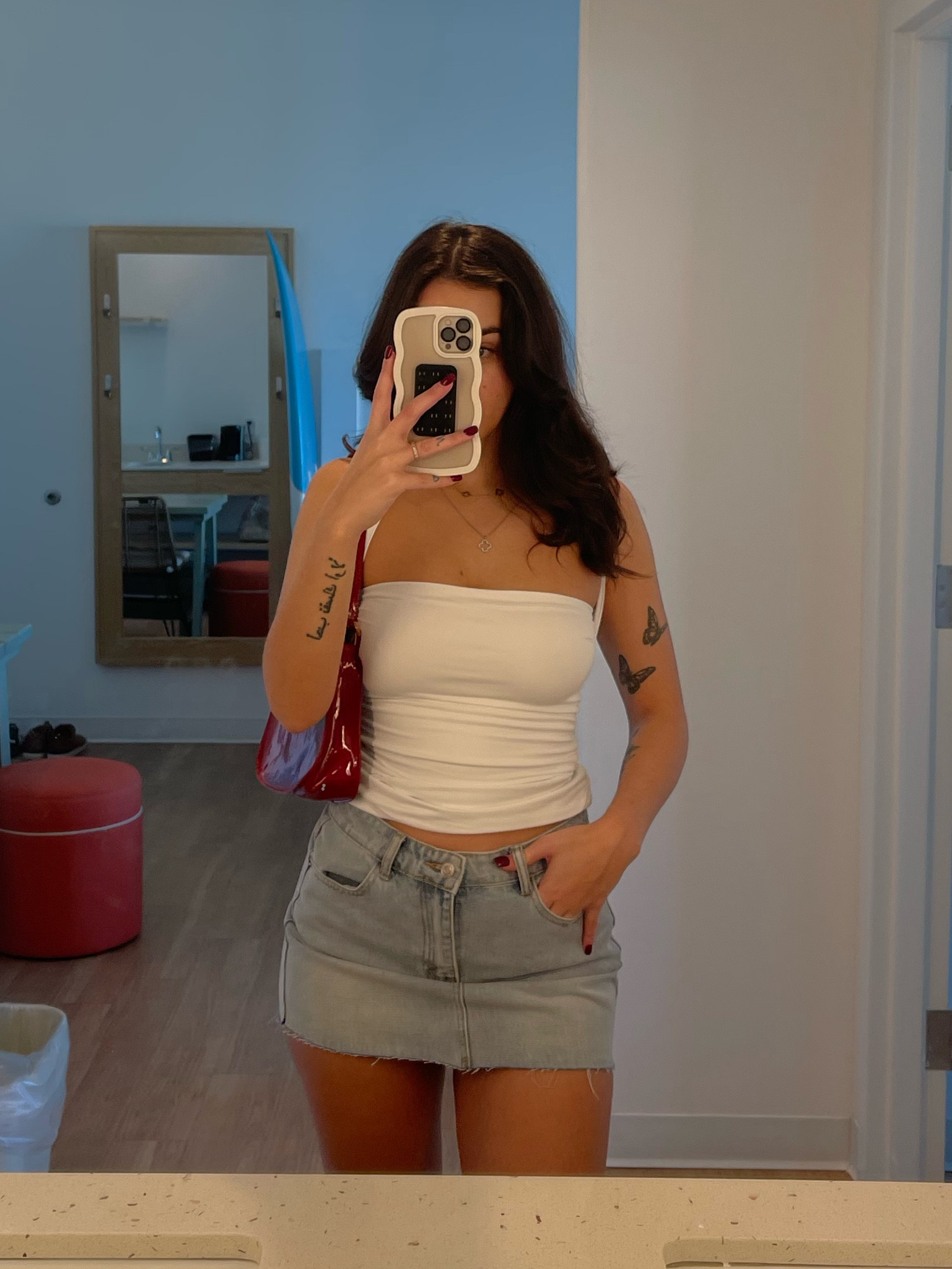 I love this outfit because the white tube top and denim skirt combination offers a chic and effortless summer vibe. The pairing is timeless and versatile, perfect for casual outings and showing off those cute accessories.
