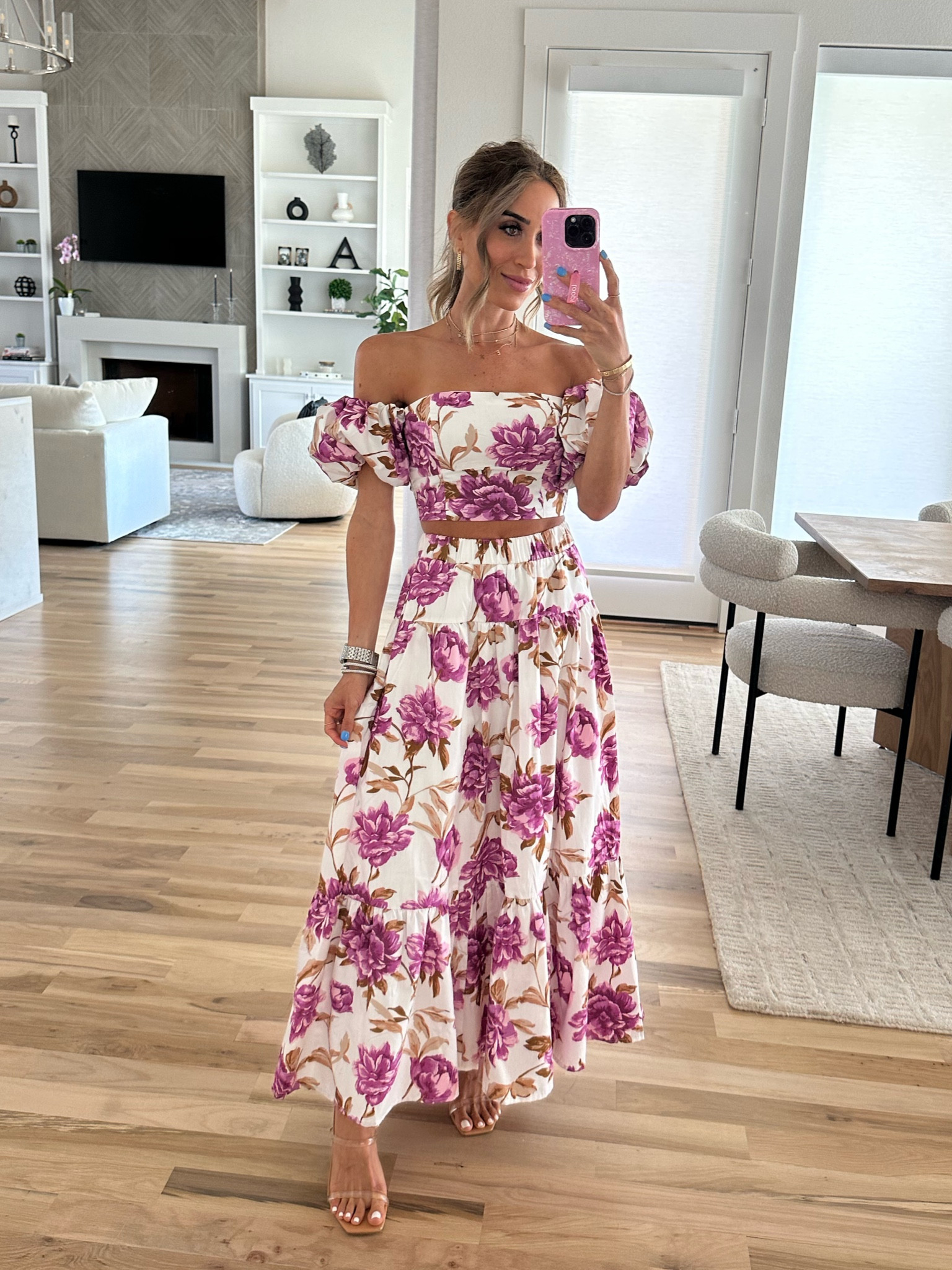 I love how this outfit combines a vibrant floral print with a flattering, off-shoulder crop top and flowing maxi skirt, creating a balanced and effortless summer look. The harmonious coordination and light, airy fabric make it perfect for both casual outings and more dressed-up occasions.