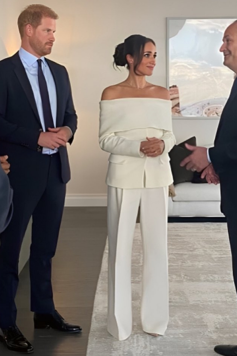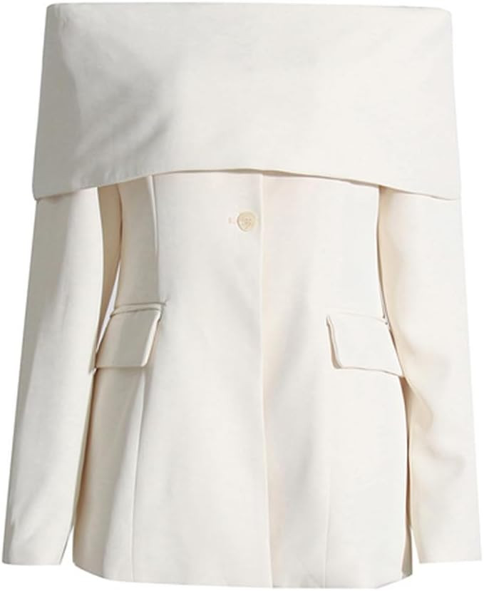 I love this outfit for its modern elegance; the off-the-shoulder top paired with tailored white pants creates a chic and sophisticated ensemble. The clean lines and monochromatic palette exude confidence and timeless style.