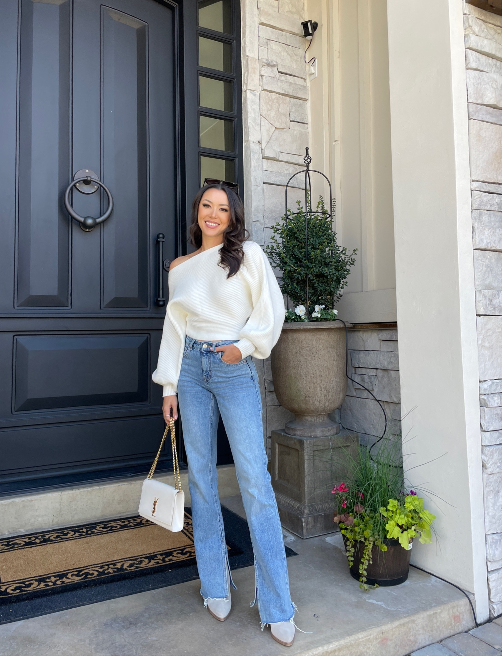 I love how the off-shoulder sweater adds a chic, relaxed vibe while the high-waisted, flared jeans elongate the legs and provide a classic silhouette. The neutral tones of the sweater, bag, and shoes create a cohesive, polished look that’s perfect for any casual outing.