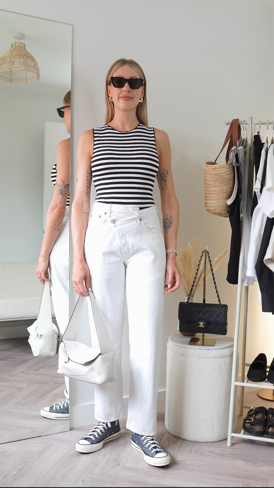 I love how the classic stripes of the sleeveless top effortlessly complement the crisp, white high-waisted jeans, creating a timeless and chic look. The addition of understated black sunglasses and Converse sneakers adds a touch of casual coolness that is both comfortable and stylish.