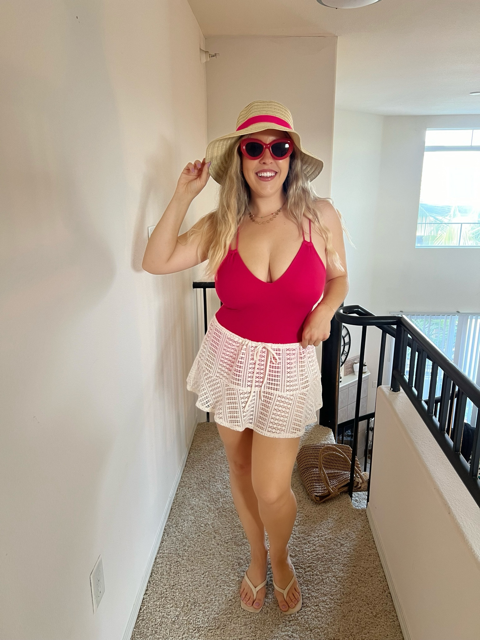 I love this outfit because the vibrant red top pairs perfectly with the delicate white skirt, creating a balanced and eye-catching look. The hat and sunglasses add a chic, summery touch that completes the ensemble beautifully.