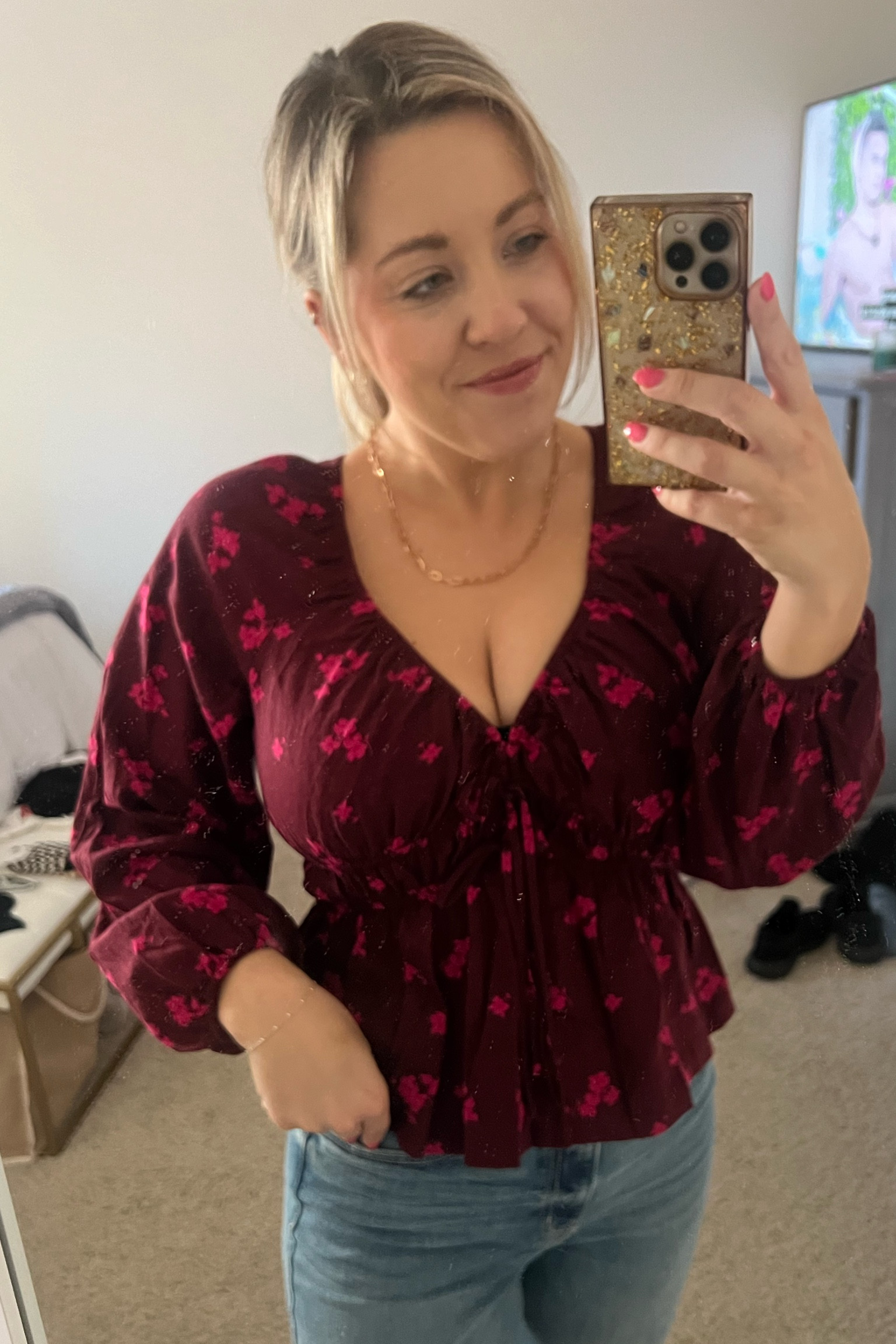 I love how the deep burgundy top with subtle floral patterns exudes elegance while the fitted and cinched waist accentuates the figure perfectly. Paired with casual jeans, it achieves a stylish balance between dressy and laid-back chic.