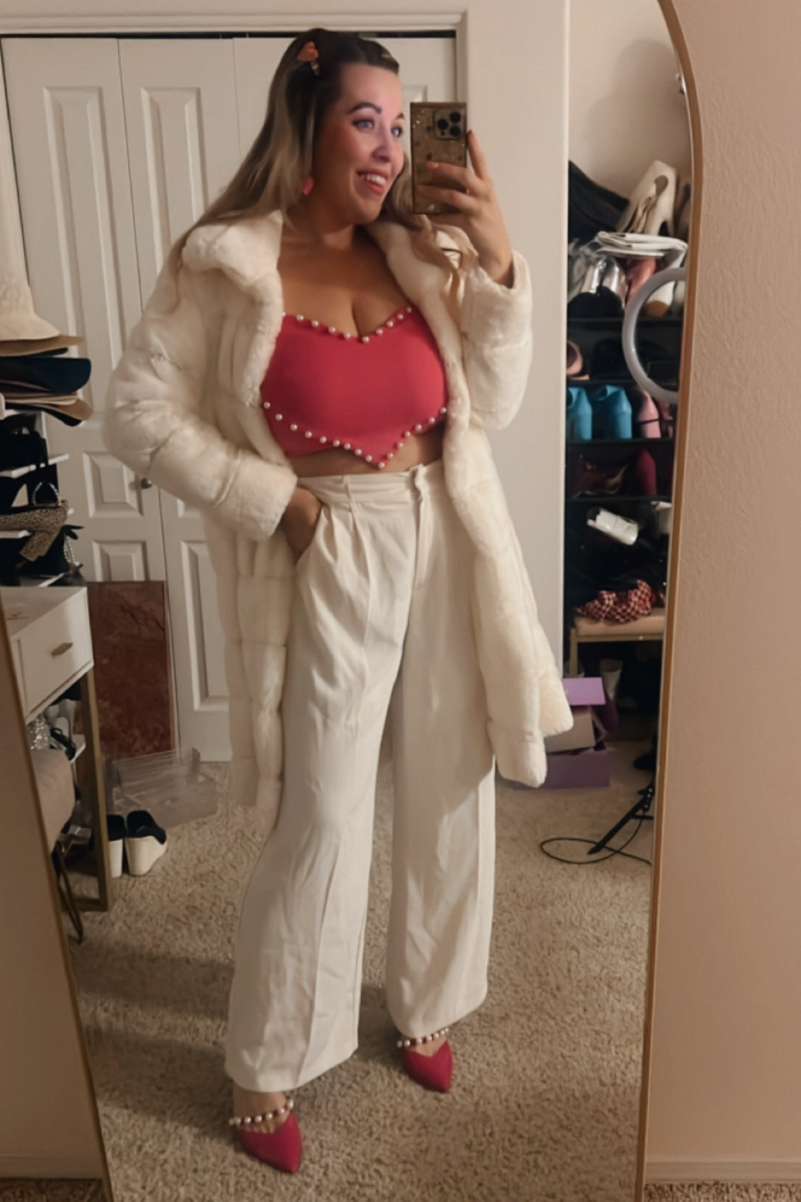 I love how the bold red crop top with pearl detailing adds a chic, playful touch to the sophisticated all-white ensemble, creating a stunning contrast. The luxurious white coat and wide-leg pants exude elegance and confidence, making it a perfect outfit for a stylish winter outing.