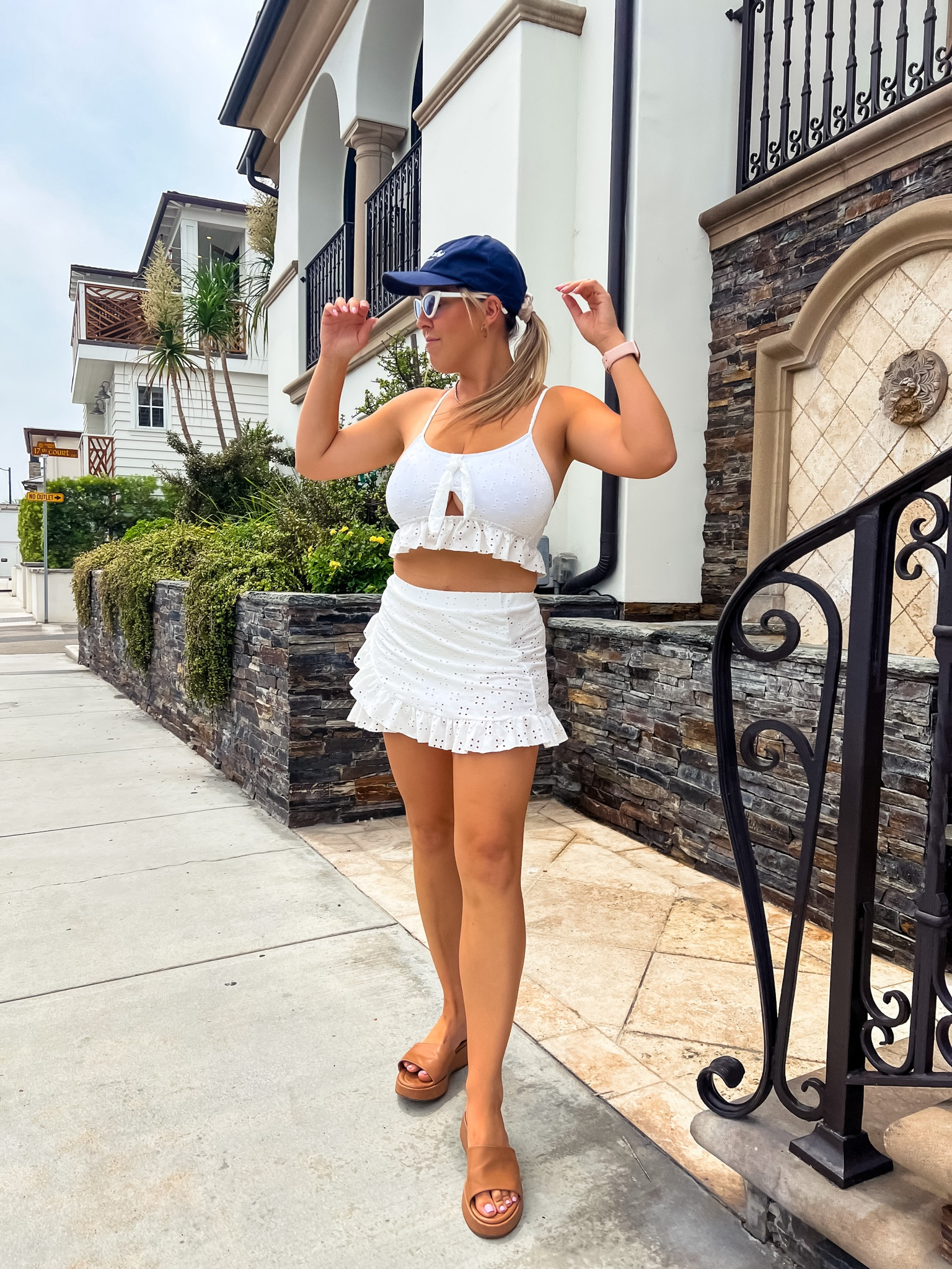 I love how the white, eyelet lace top and skirt set exudes summer freshness and pairs perfectly with the casual navy cap for a balanced, chic look. The warm brown wedges add just the right touch of earthy contrast, making the outfit effortlessly stylish.