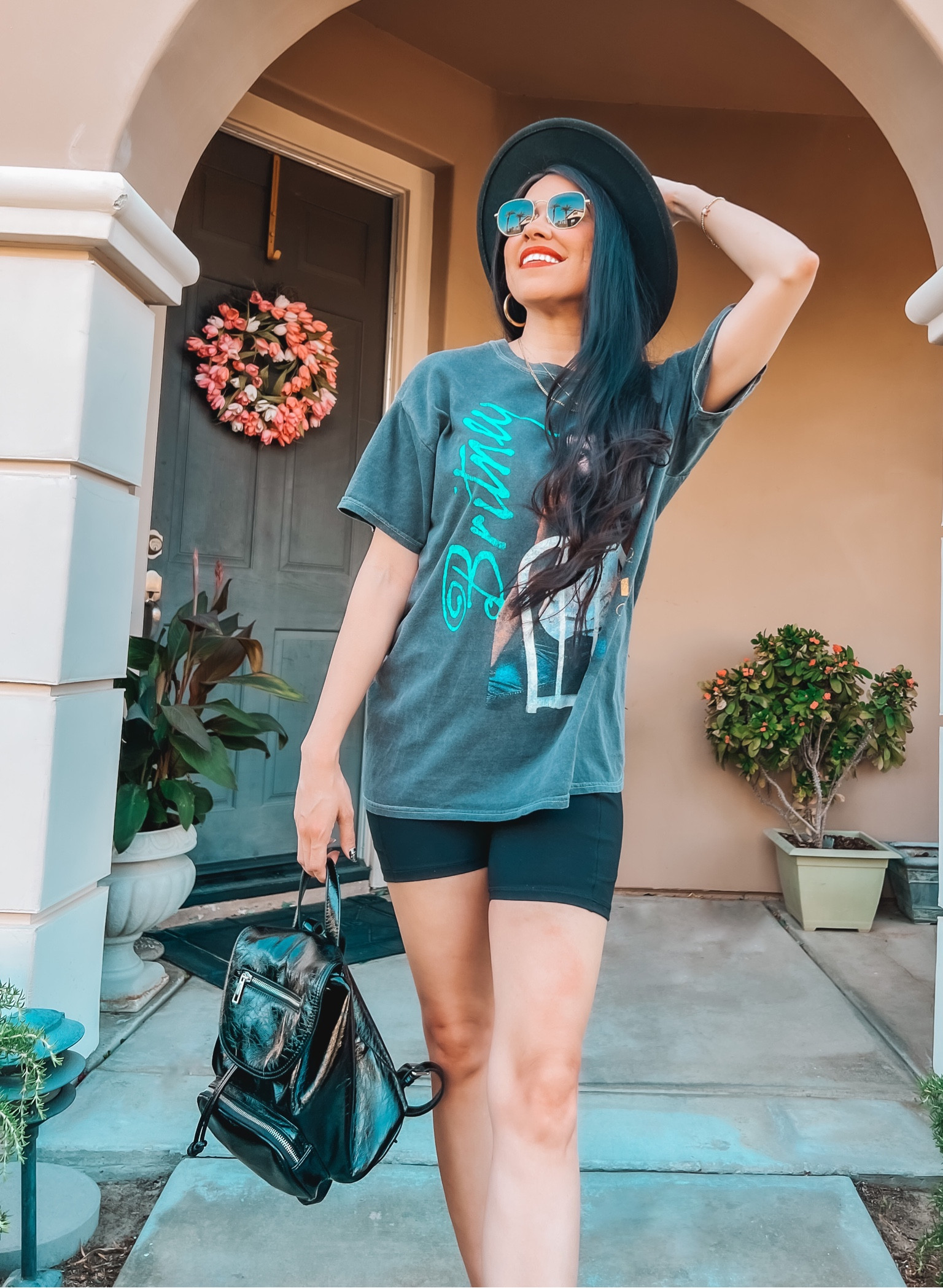 The relaxed fit of the graphic tee paired with the tailored shorts strikes a perfect balance between comfort and style, while the accessory choices—a wide-brimmed hat, standout sunglasses, and a chic backpack—add a polished, personal touch to this casual ensemble.