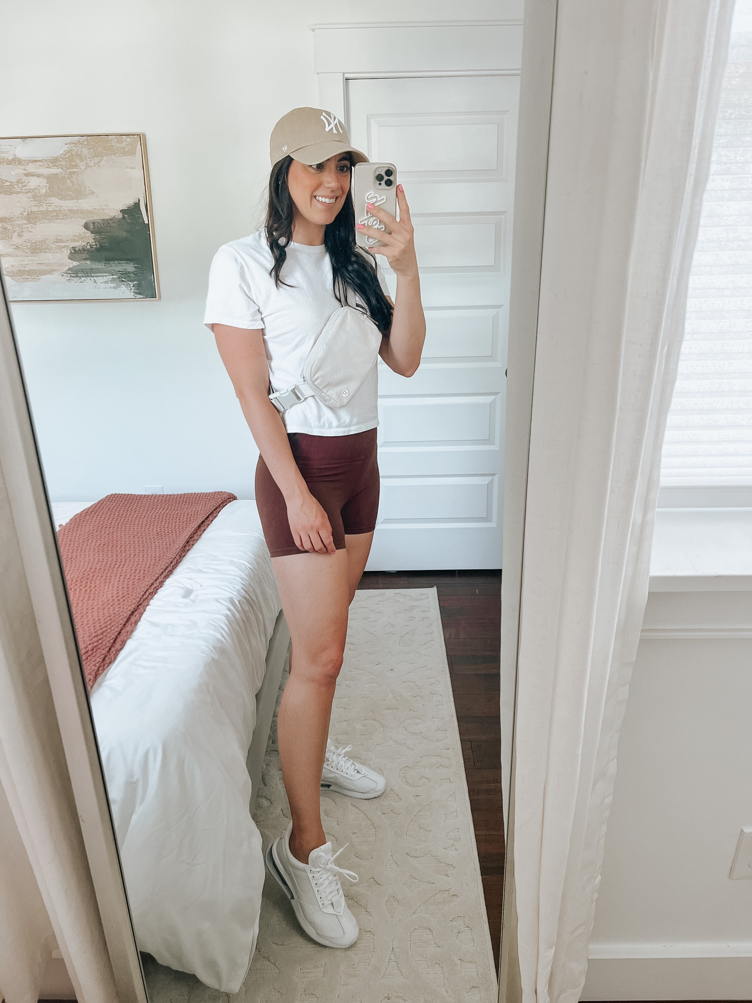 The outfit is a perfect blend of sporty and casual, showcasing a comfortable yet stylish crop top and shorts that make for an ideal athleisure ensemble. The neutral colors are on-trend, and the accessorizing with a simple waist bag and sneakers completes a clean, functional look suitable for a variety of laid-back occasions.