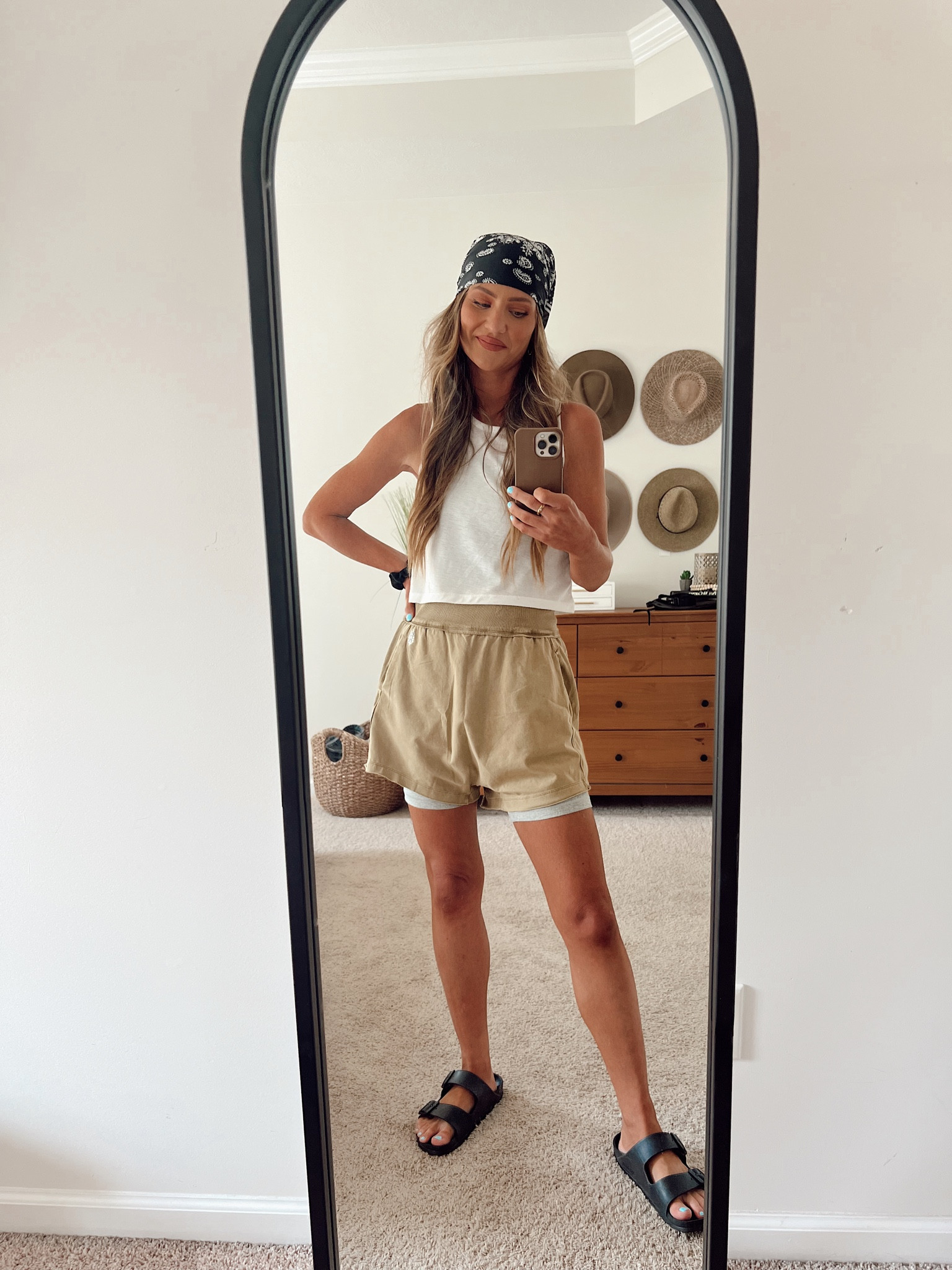 The outfit exudes a casual yet chic vibe with a well-fitted pastel crop top that complements the neutral-toned shorts, creating a balanced and streamlined silhouette. Additionally, the attire is perfectly suited for outdoor activities, offering both comfort and style.