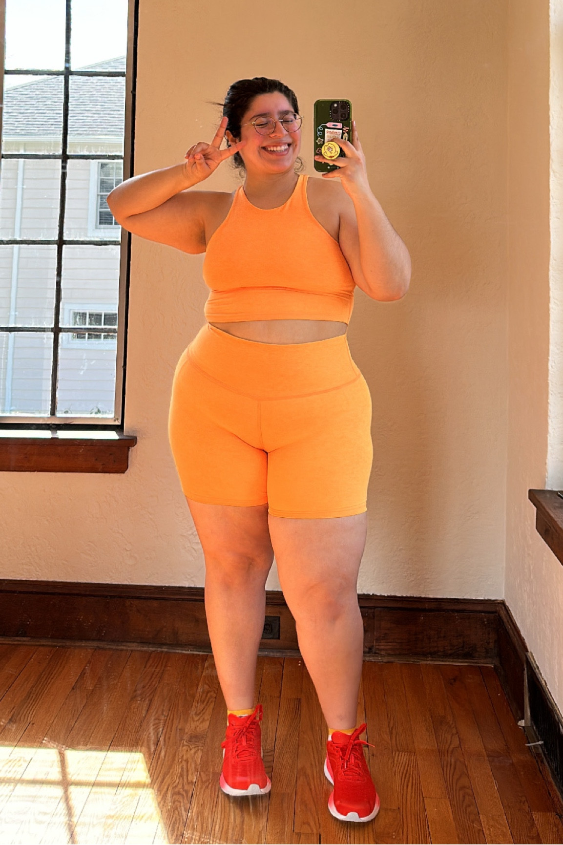 The vibrant orange shade of the outfit is fresh and energetic, creating a lively and confident look. The coordinated separates are trendy and flattering, highlighting the wearer’s figure with a modern, sporty appeal.