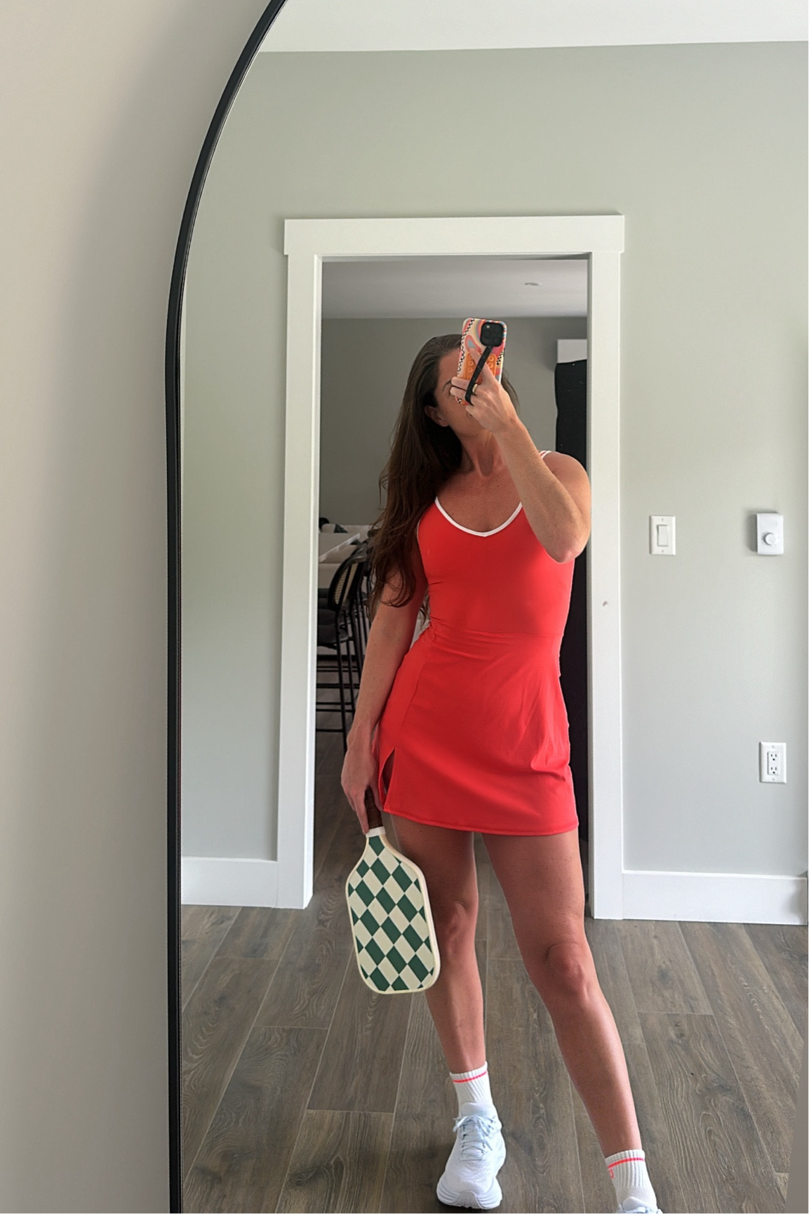 The vibrant red hue of the dress is eye-catching and exudes confidence, while the simple silhouette keeps the ensemble effortlessly chic and versatile. The white sneakers add a casual, sporty flair, perfect for a day out.