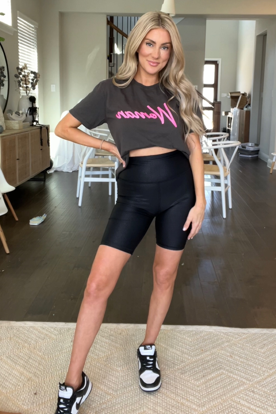 The cropped top and high-waisted biker shorts ensemble accentuate the waist, creating a flattering silhouette, while the neutral tones paired with a pop of color from the top’s graphic add a playful touch. The outfit is versatile, easily transitioning from a casual day look to an athleisure-inspired statement with its form-fitting comfort and style.