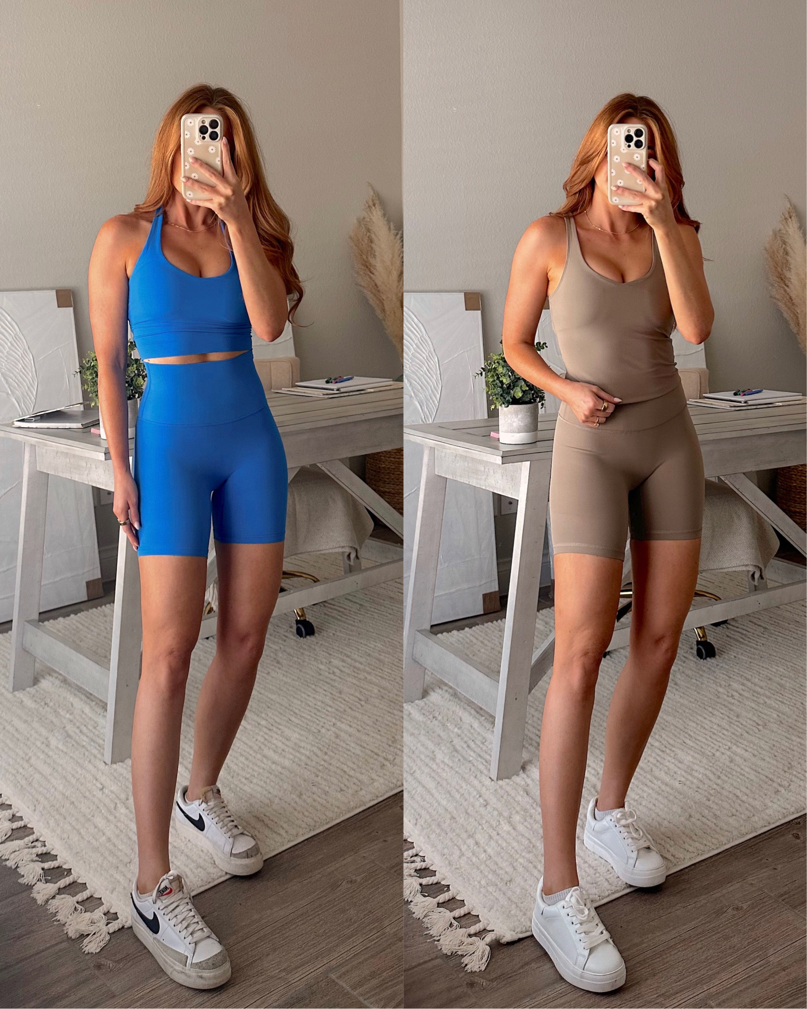 The neutral tones of the outfit give it a cohesive, streamlined look, while the combination of the oversized top and fitted biker shorts offers a trendy and comfortable balance. The addition of classic white sneakers adds a sporty, casual touch that’s perfect for a day out.