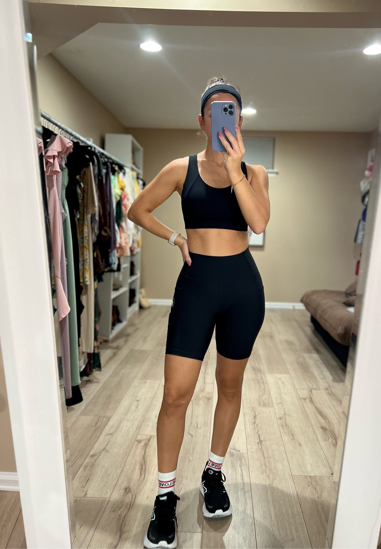 The outfit offers a sleek, sporty look with its coordinated black crop top and shorts, making it a stylish yet practical choice for an active day out. The fit is flattering, comfortable, and paired with supportive sneakers, it’s perfect for outdoor adventures while remaining fashion-forward.