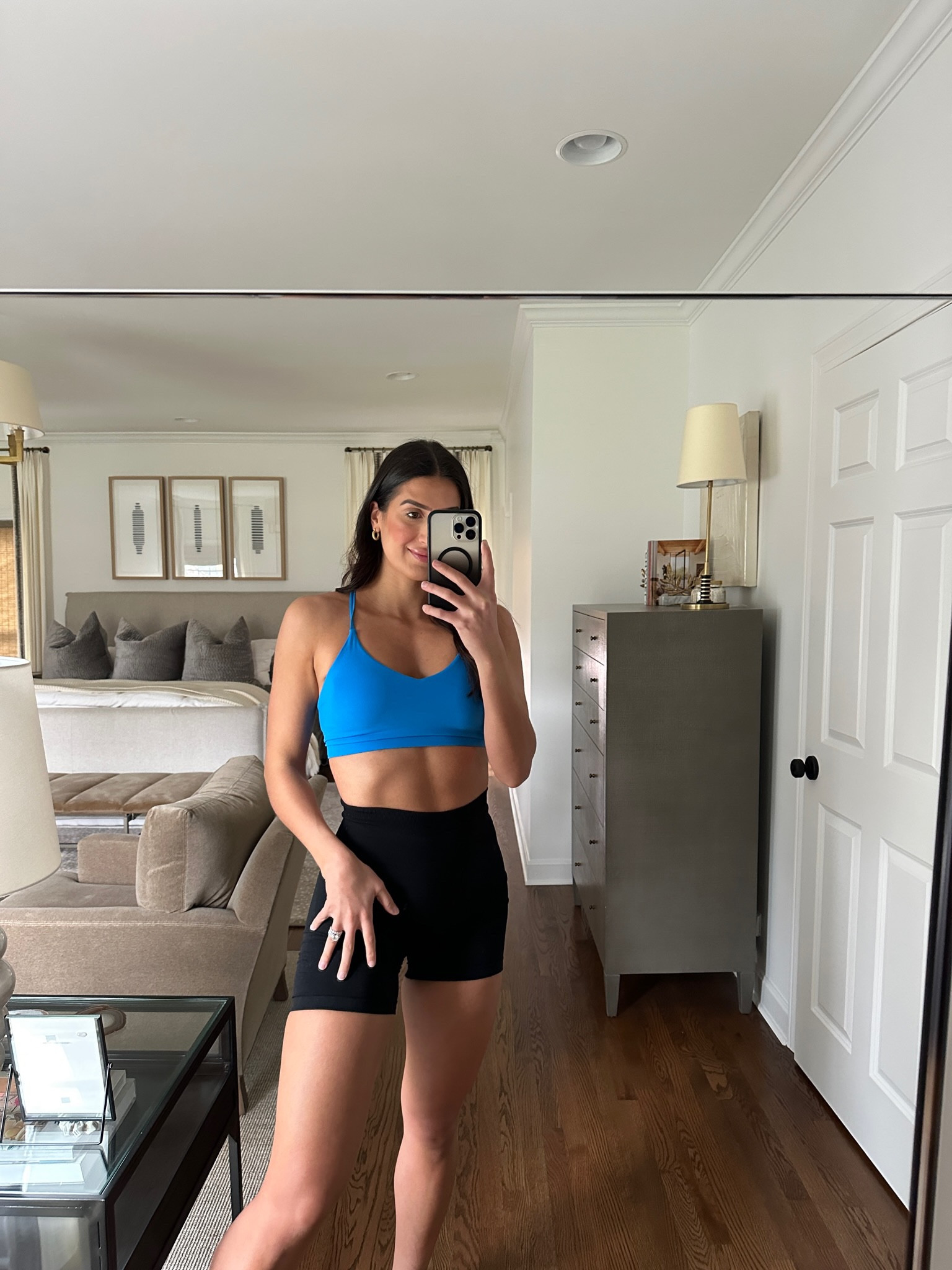 The vibrant blue sports bra adds a pop of color that contrasts beautifully with the black shorts, energizing the outfit. The fitted silhouette of both pieces promotes ease of movement and gives the ensemble a sleek, athletic look that is both stylish and functional for an active lifestyle.