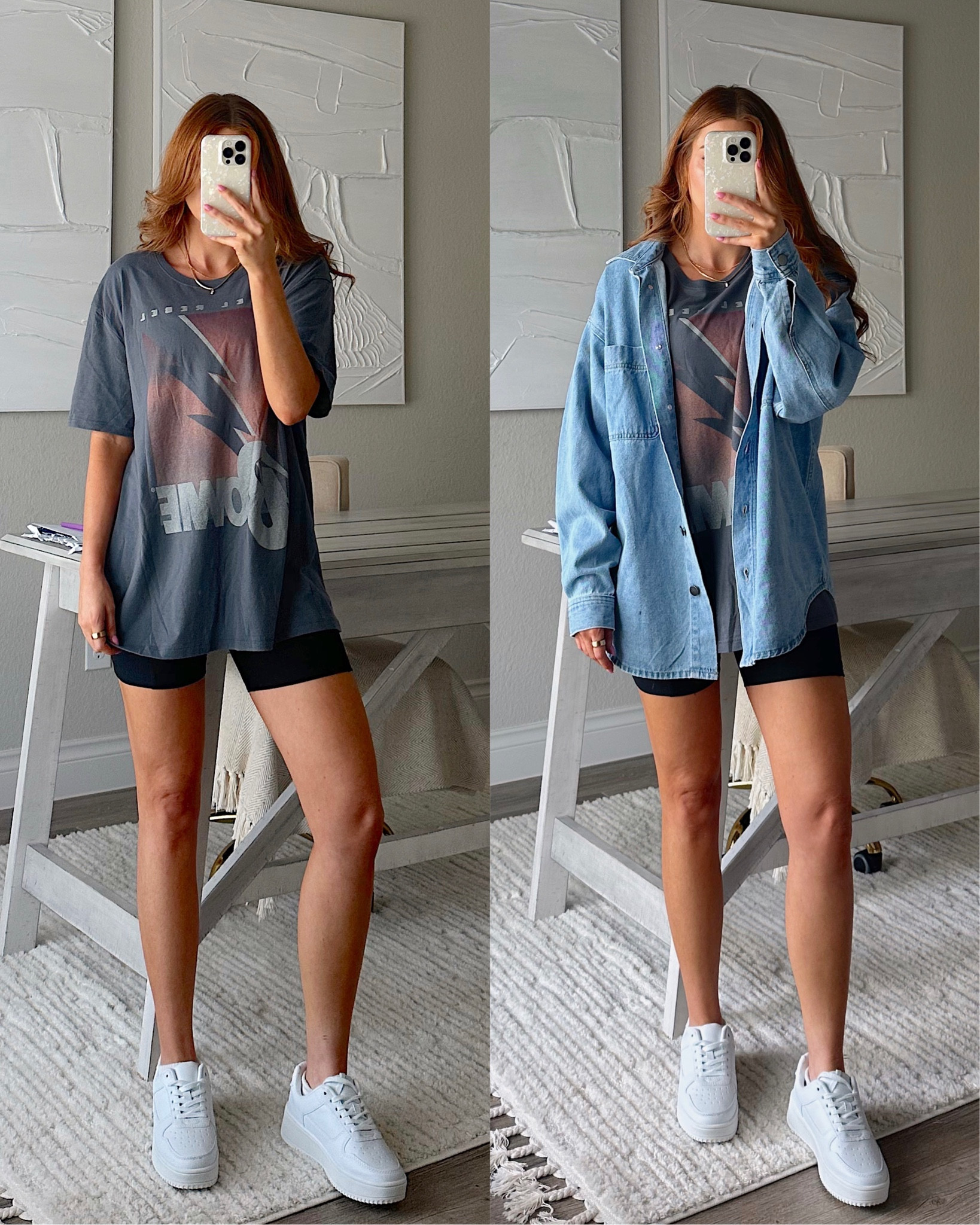 The oversized graphic tee paired with the denim jacket adds a trendy, laid-back vibe perfect for casual outings. The black shorts and crisp white sneakers round off the look with a classic, sporty touch that’s both comfortable and stylish.