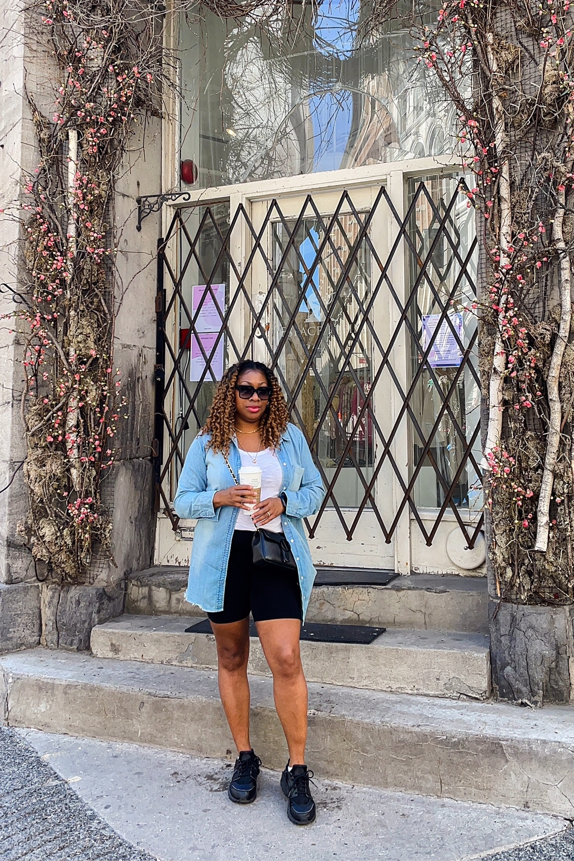 The light blue denim jacket offers a fresh and casual vibe, perfectly complementing the simplicity of the white top and black shorts, which create a classic, versatile base. The outfit is anchored with practical black sneakers, making it ideal for a fashionable, yet comfortable day out.