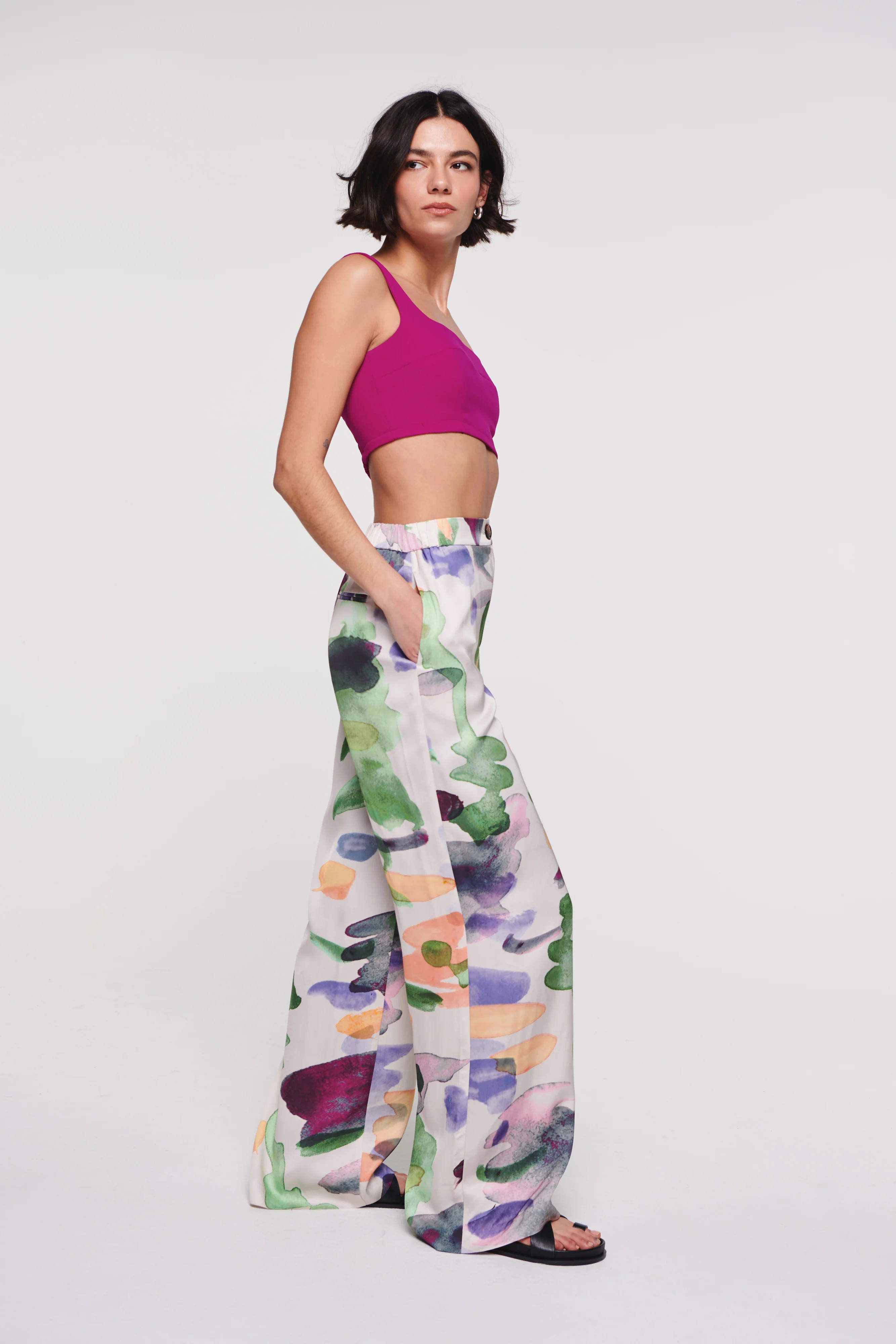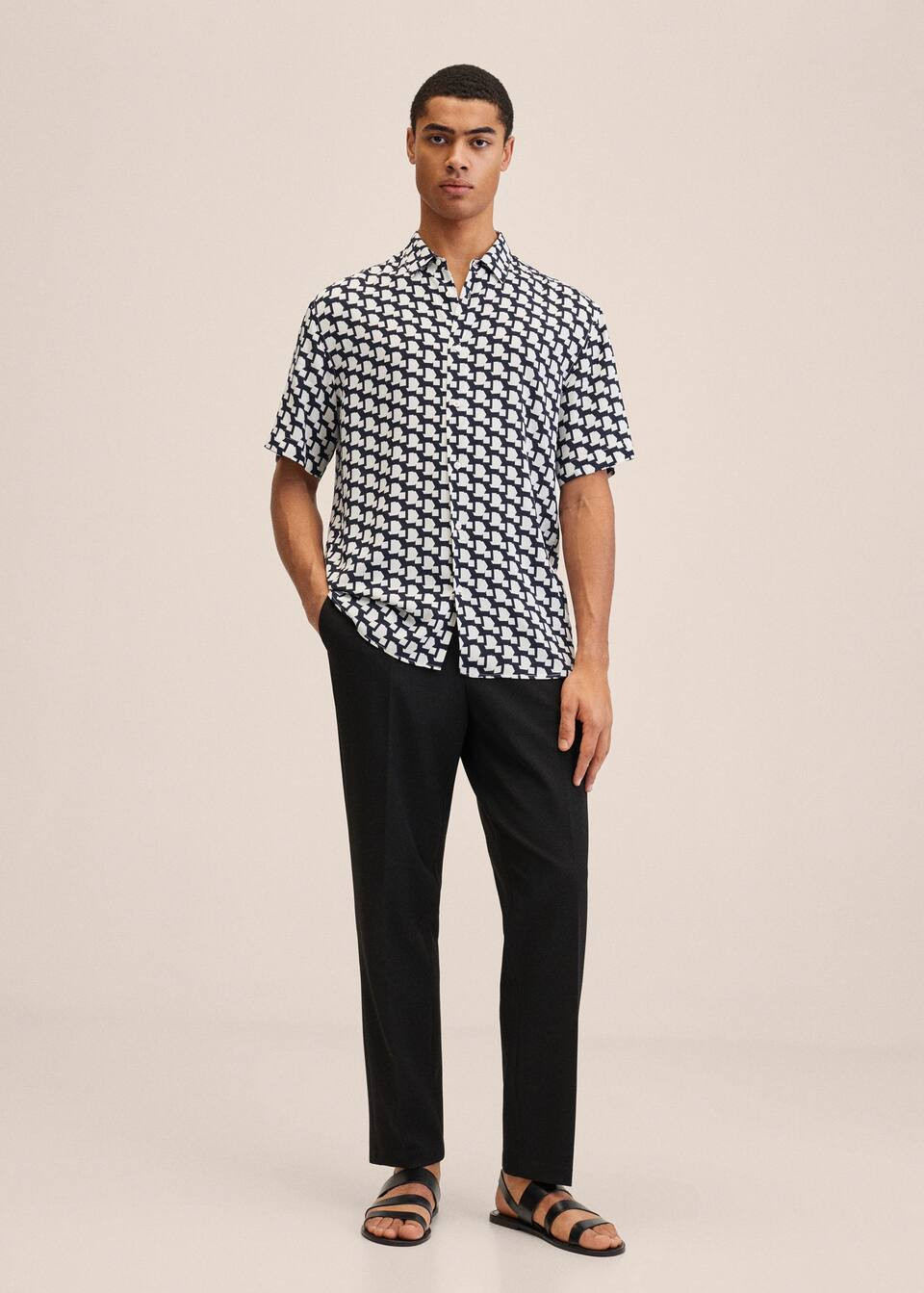 I love how the floral shirt pairs effortlessly with the light shorts, creating a perfect balance of style and comfort. The chic geometric top combined with the relaxed white pants and stylish heels elevates the look to a sophisticated yet casual ensemble.