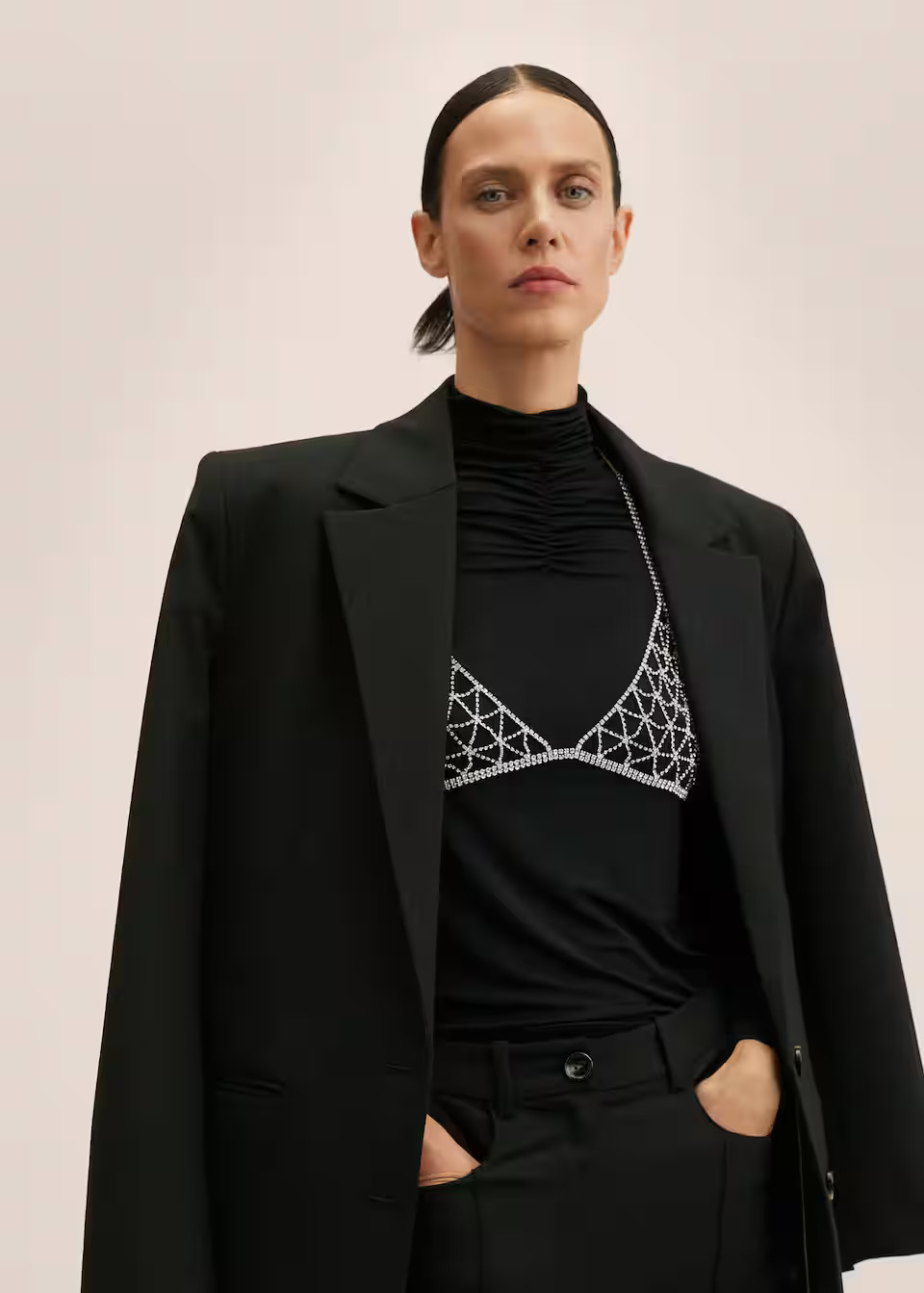I love how the oversized pastel blazer paired with the chic mini bag creates a perfect blend of sophistication and modern simplicity. The casual footwear and sunglasses add a laid-back vibe, making the entire ensemble effortlessly stylish.