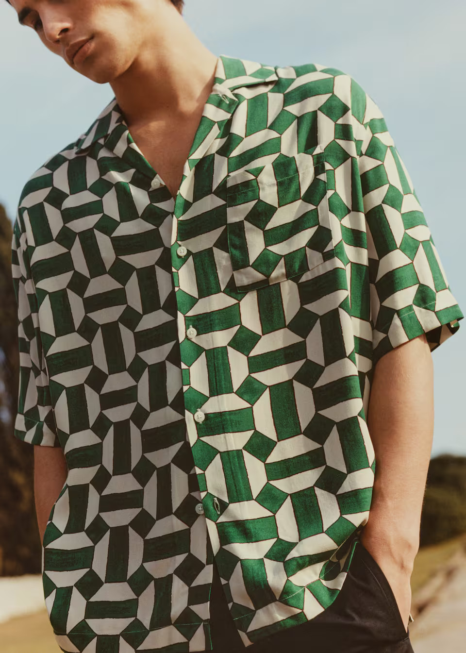 I love how the monochromatic patterns add a bold, modern touch to their summery beach vibe. The oversized sunglasses perfectly complement the overall look, providing both style and sun protection.