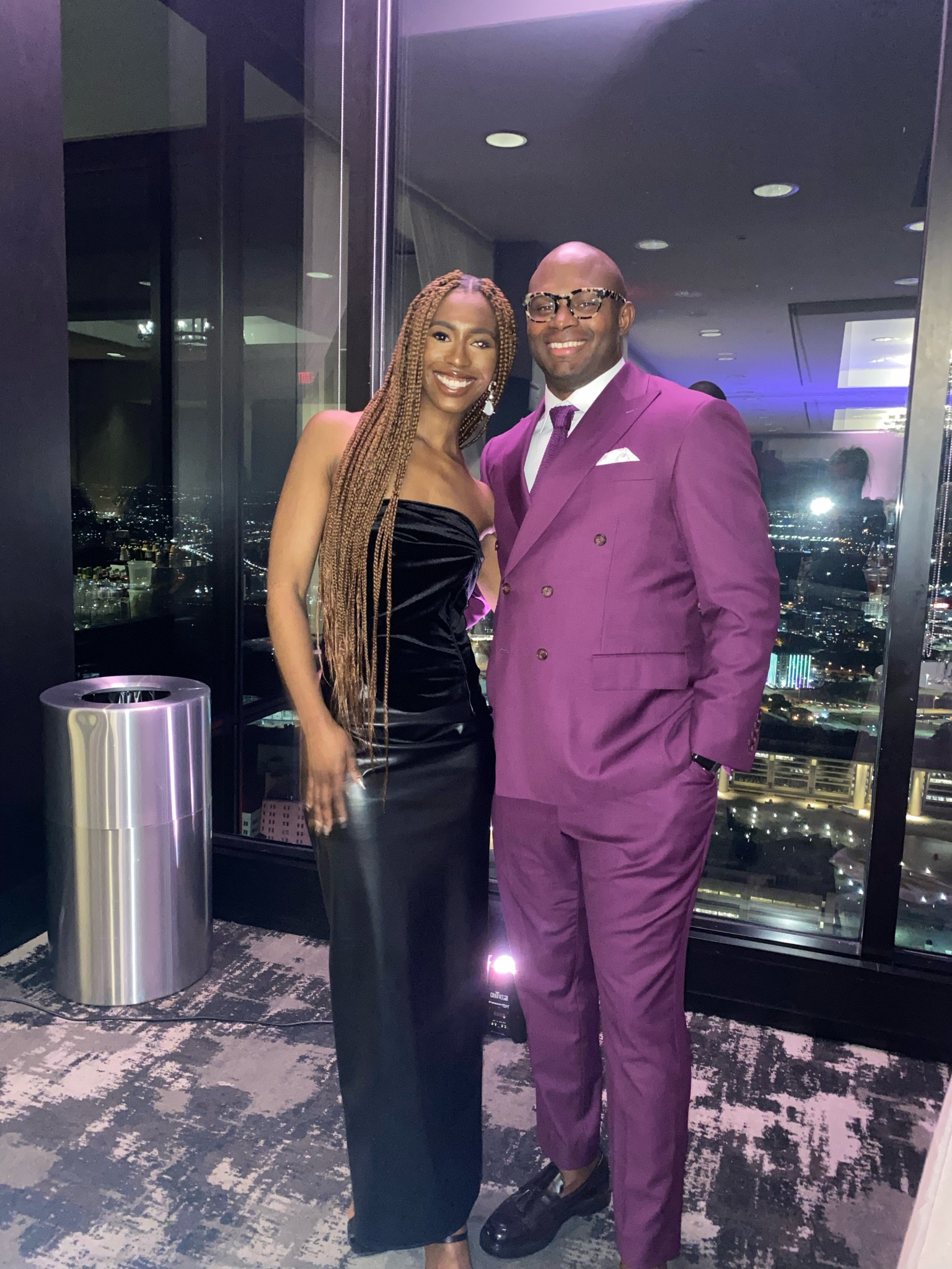 I love how the sleek black dress elegantly complements her figure, while the rich purple suit adds a bold, sophisticated touch. Together, they create a stunning, eye-catching contrast that’s perfect for a night out in the city.