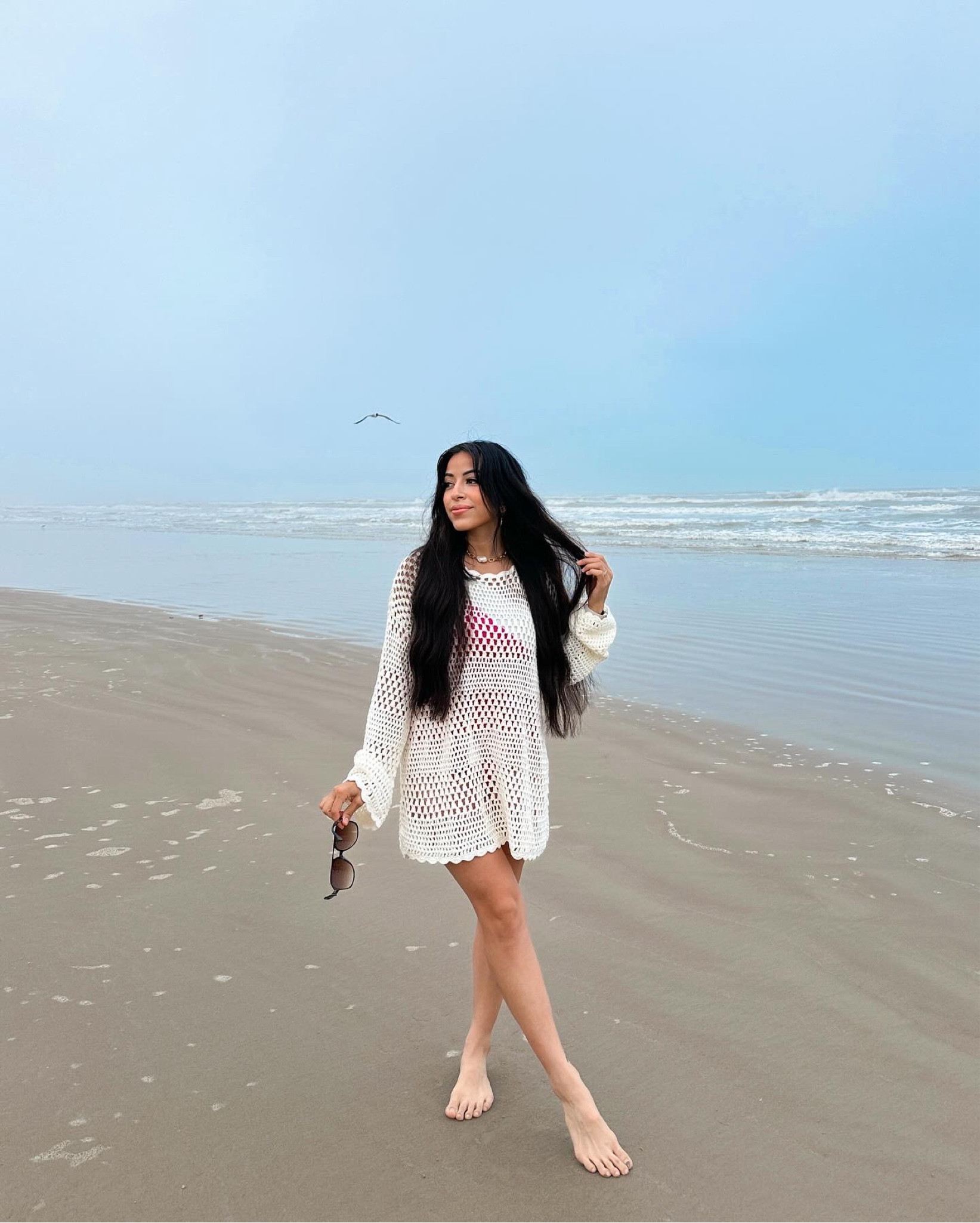 The breezy white crochet dress perfectly captures a relaxed beach vibe, effortlessly balancing comfort and style. Its flowy silhouette and playful texture make it an ideal choice for a casual seaside stroll.