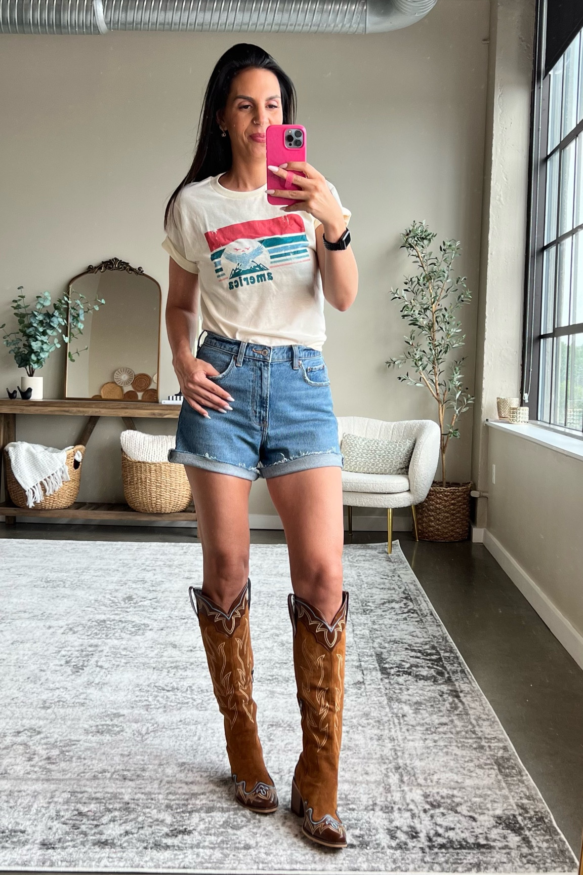 The combination of fitted denim shorts and a casual graphic tee delivers a classic, effortless summer style, while the high-rise cowboy boots add a bold, on-trend statement that elevates the entire look with a touch of Western flair.