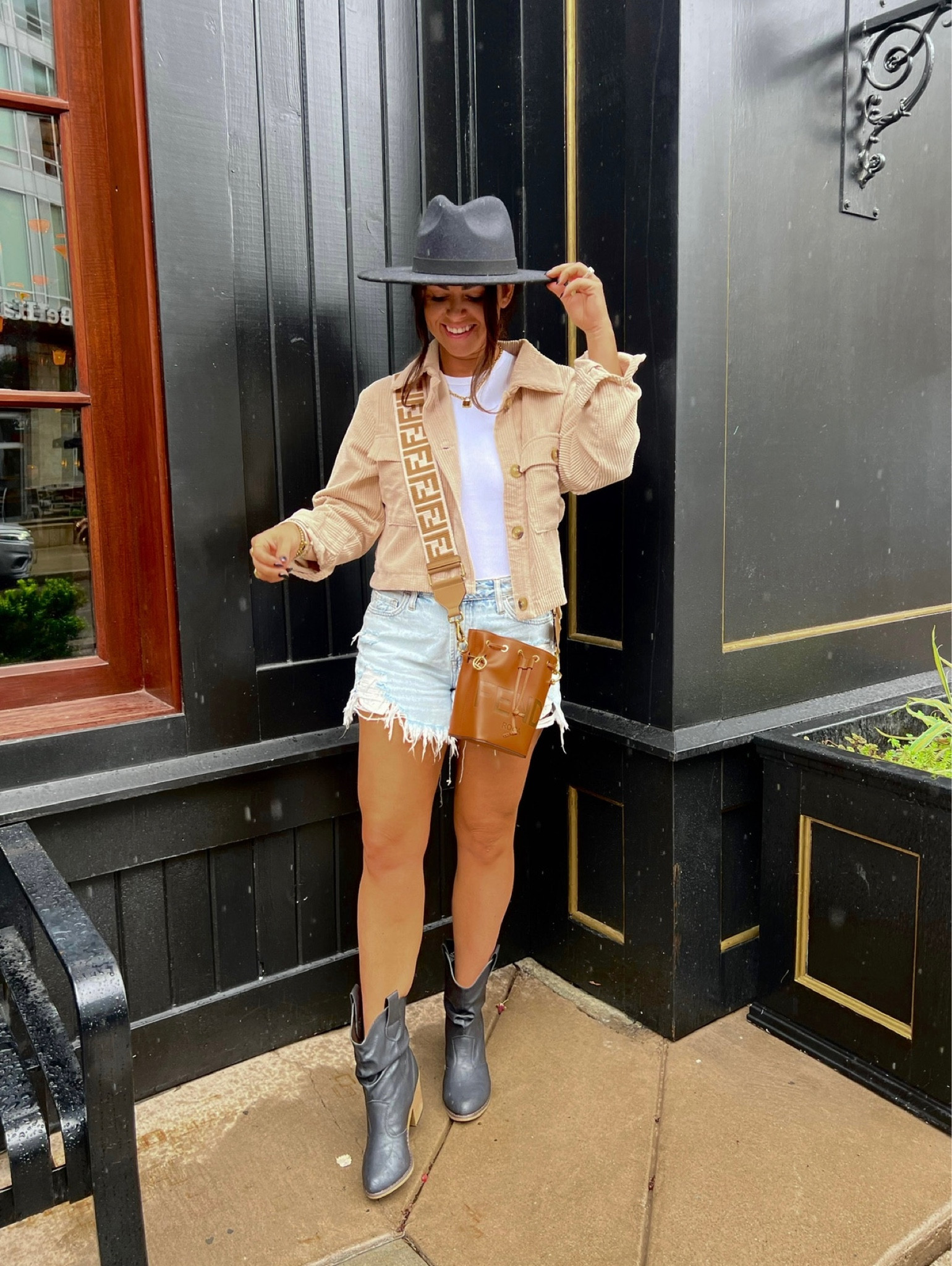 The ensemble achieves a chic, bohemian vibe with a balance of textures, combining the rugged appeal of denim cutoffs with a structured shirt and the sleek finish of the leather accessories. The earthy tones, paired with the statement boots and hat, create a harmonious and stylish look perfect for a casual outing.