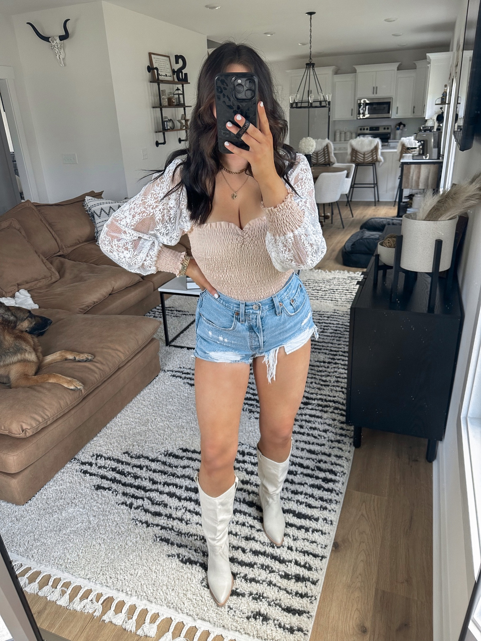 The outfit expertly combines classic denim cutoffs with a romantic lace top, creating a playful yet stylish contrast that’s perfect for a casual outing. The white boots add a modern twist to the ensemble, elevating the look with an unexpected yet cohesive touch.