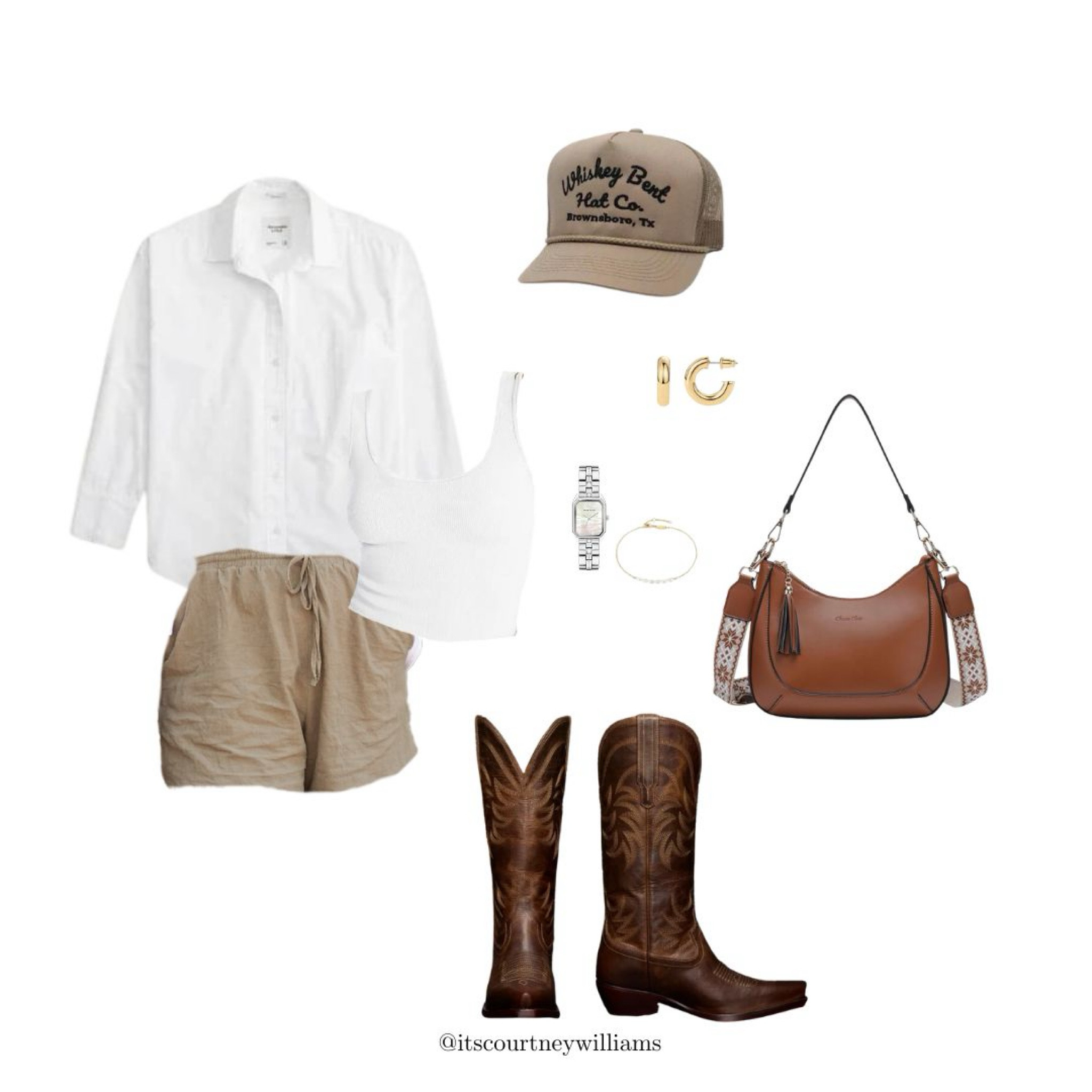 The crisp white shirt offers a timeless and versatile foundation, pairing well with the earthy tones of the shorts and accessories for a harmonious, relaxed aesthetic. The classic cowboy boots add a bold statement with a touch of rustic charm, while the well-chosen accessories tie the ensemble together with a hint of sophistication.