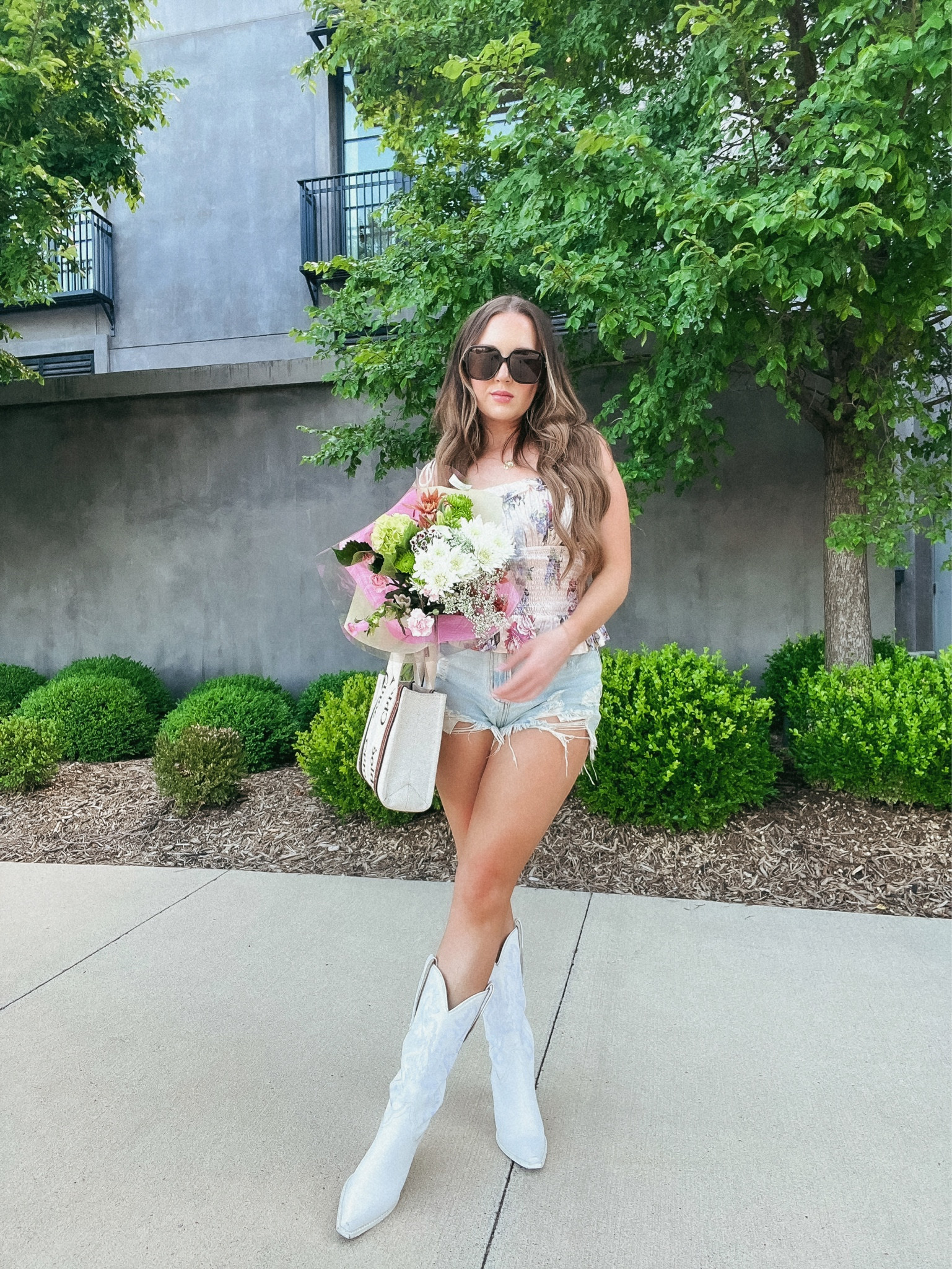 The outfit presents a delightful blend of bohemian chic with its playful, floral off-shoulder top and frayed denim shorts, offering a fresh, youthful vibe. The white cowboy boots add a trendy, unexpected twist, tying the ensemble together with a bold statement.