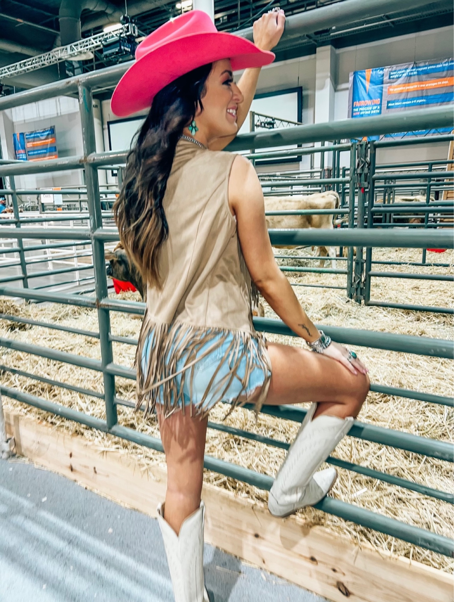 The ensemble showcases a playful and confident Western flair with its bold pink hat and fringe detailing, creating a statement that’s both chic and fun. The coordinated yet contrasting patterns and color palette exude a carefree sophistication perfect for a stylish day out.