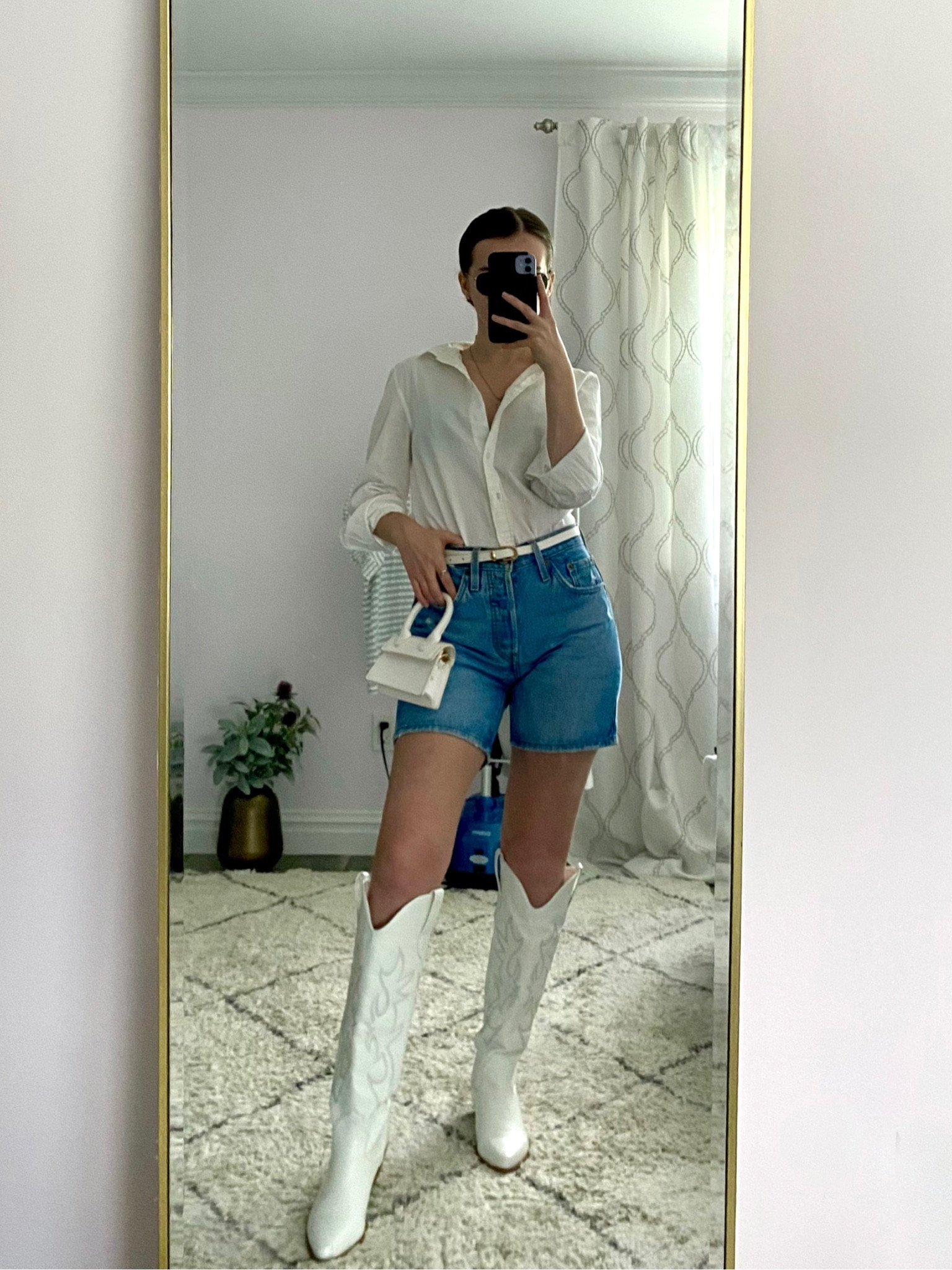 The crisp white shirt paired with high-waisted denim shorts offers a fresh and effortlessly chic vibe, while the white cowboy boots add a bold and fashionable twist to the ensemble. This outfit perfectly balances casual comfort with a touch of edgy style.