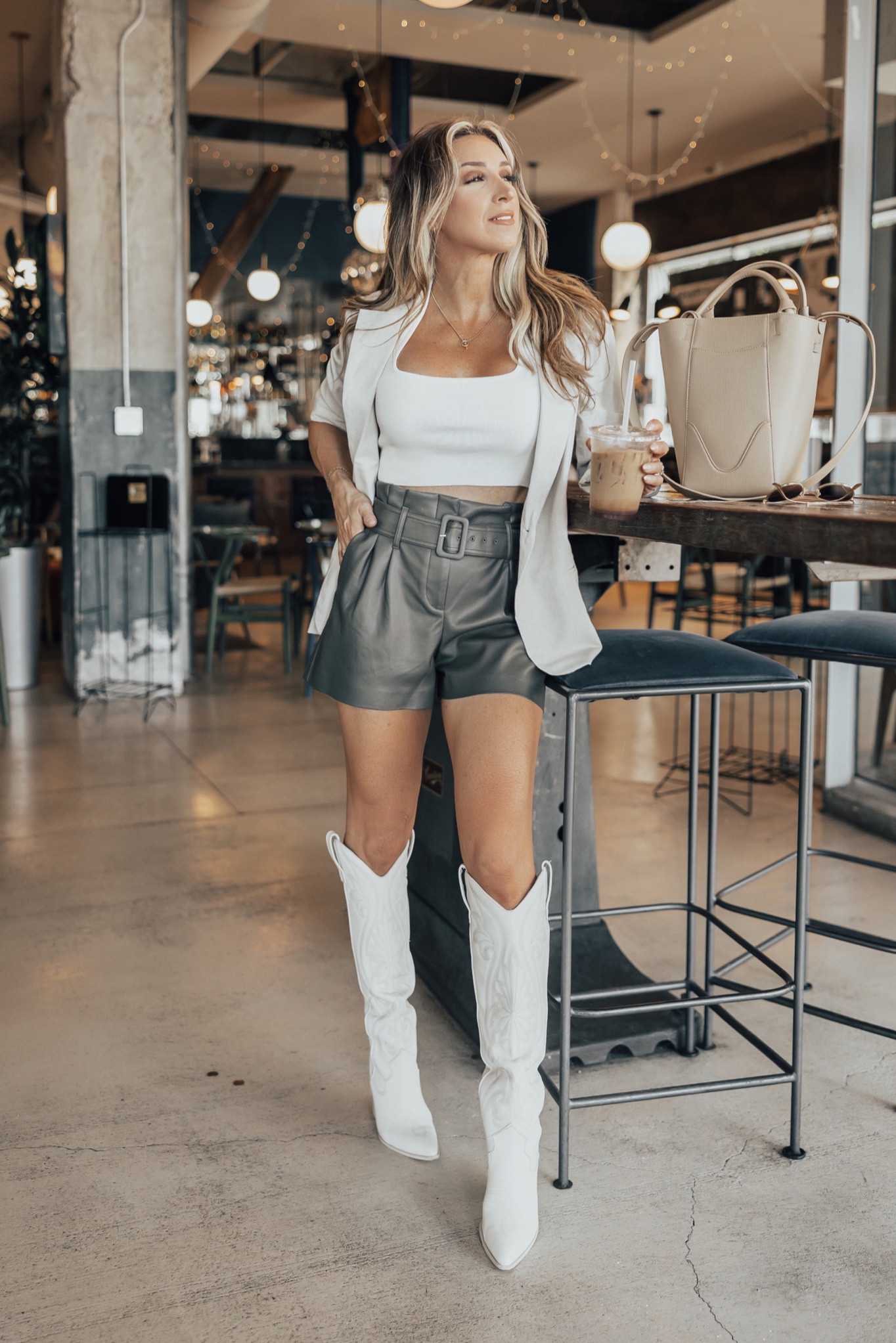 The outfit masterfully balances sophistication with edginess; the high-waisted leather shorts and white blazer combo bring a modern twist to professional attire. The white knee-high boots add a daring element while complementing the overall palette, making for a chic and cohesive look.