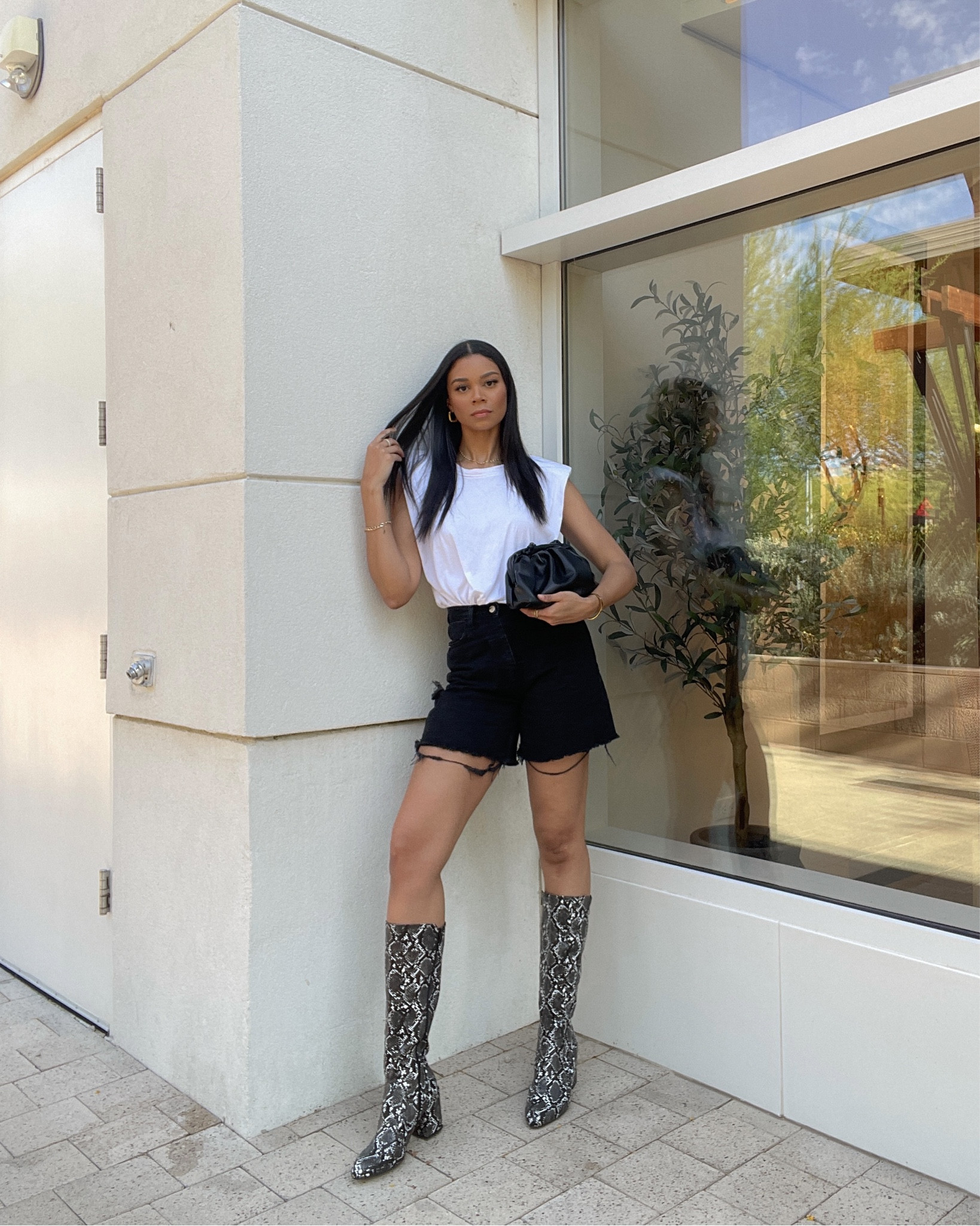 The outfit strikes an excellent balance between casual and bold, with the plain white tee and black shorts offering a classic, understated base that allows the snake print boots to make a strong, trendy statement. The simplicity of the top and shorts accentuates the figure, while the boots add texture and interest, creating an eye-catching contrast.