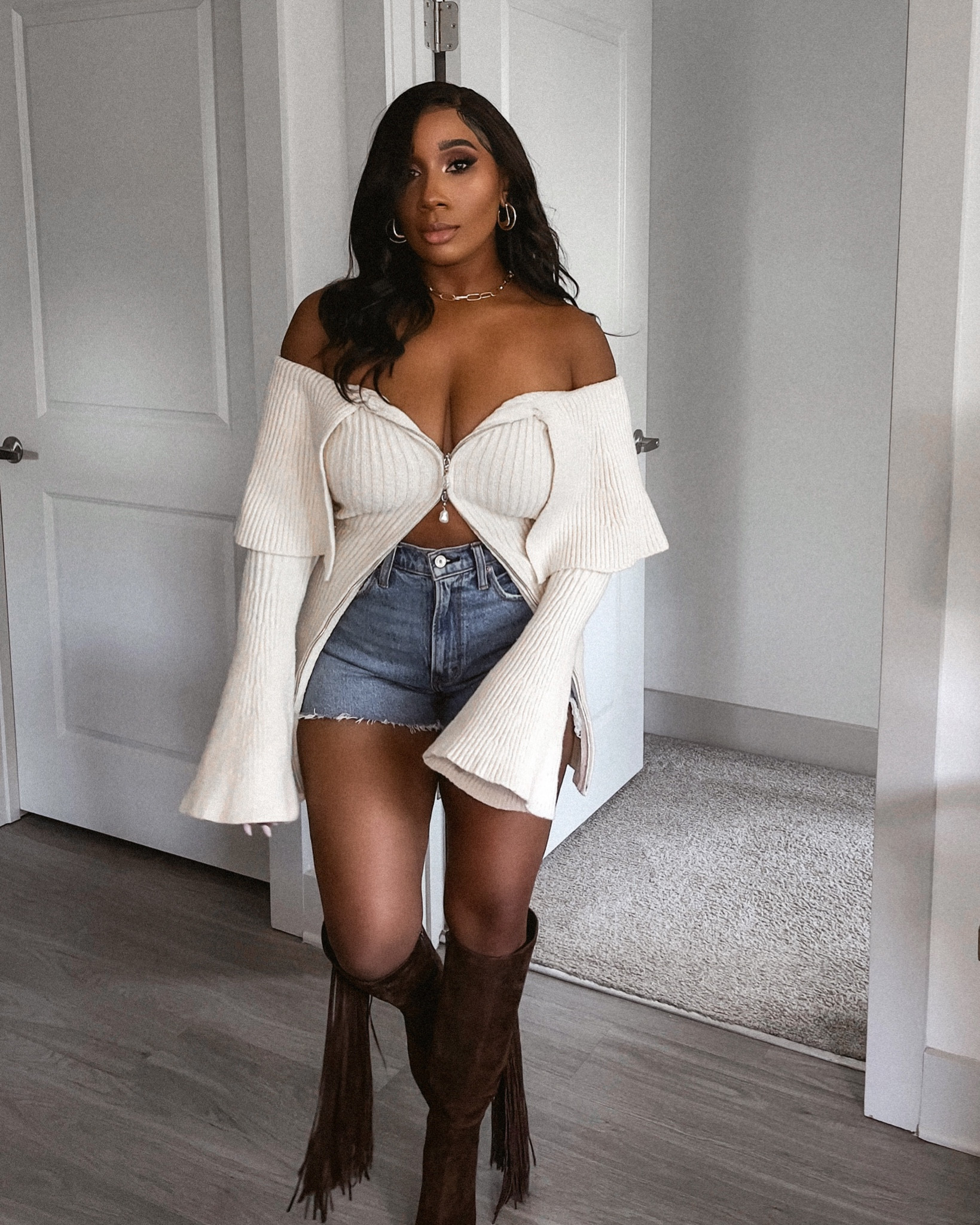 The neutral color palette of the off-the-shoulder sweater offers a versatile and timeless elegance, while the unique cut-out detailing adds a daring edge that accentuates the wearer’s figure. The combination of tight-fitting denim and fringe boots injects a casual yet chic vibe, perfect for a statement-making ensemble.