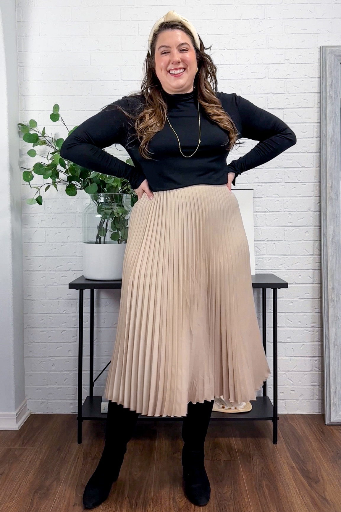 I love how the pleated beige skirt adds graceful movement and sophistication, while the fitted black top and gold accessories create an elegant, cohesive look. The combination of classic neutrals makes this outfit versatile for any occasion.
