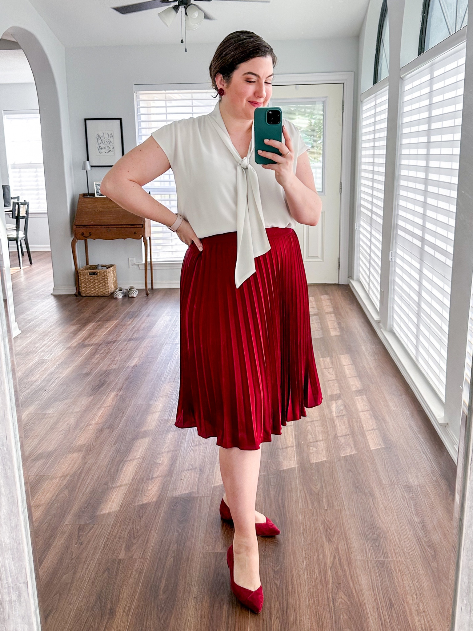 I love how the flowing, pleated red skirt adds a pop of color and elegance, while the classic white blouse with a bow detail keeps the look sophisticated and timeless. The red heels tie the outfit together perfectly, making it both stylish and cohesive.