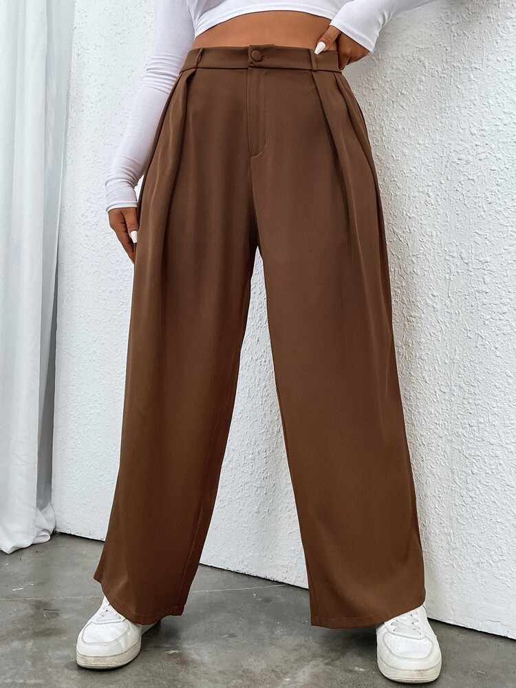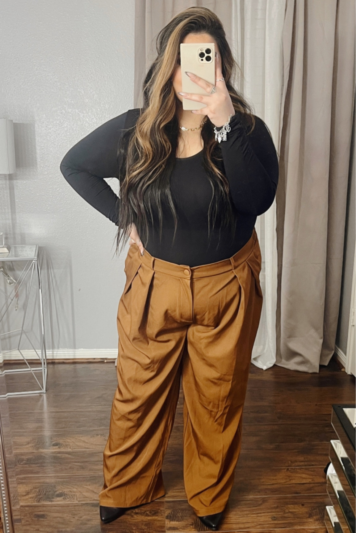 I love how the high-waisted, wide-leg trousers elongate the legs while the fitted black top creates a sleek, balanced silhouette. The earthy brown tones of the pants add a sophisticated touch, perfect for both professional and casual settings.