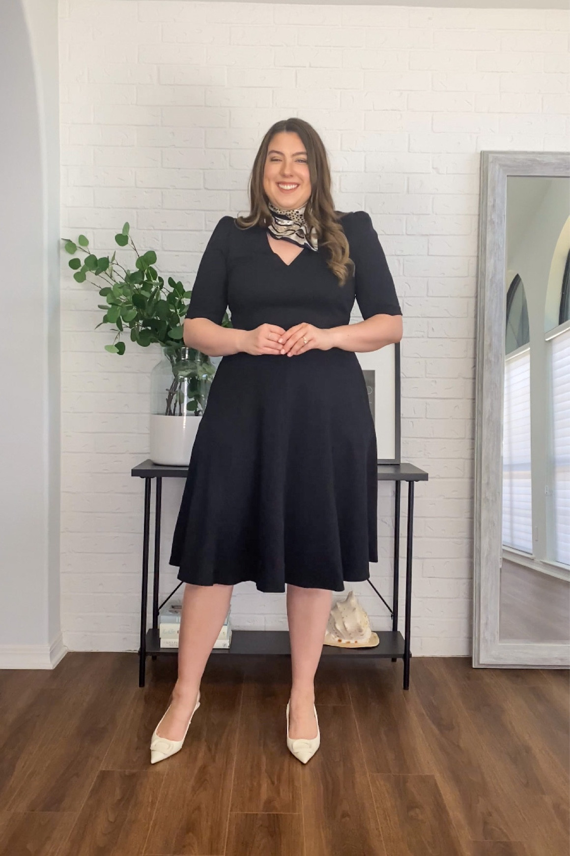I love this outfit because the fit-and-flare dress accentuates the waist beautifully and the scarf adds a chic, sophisticated touch. The neutral heels perfectly balance the look and elongate the legs.