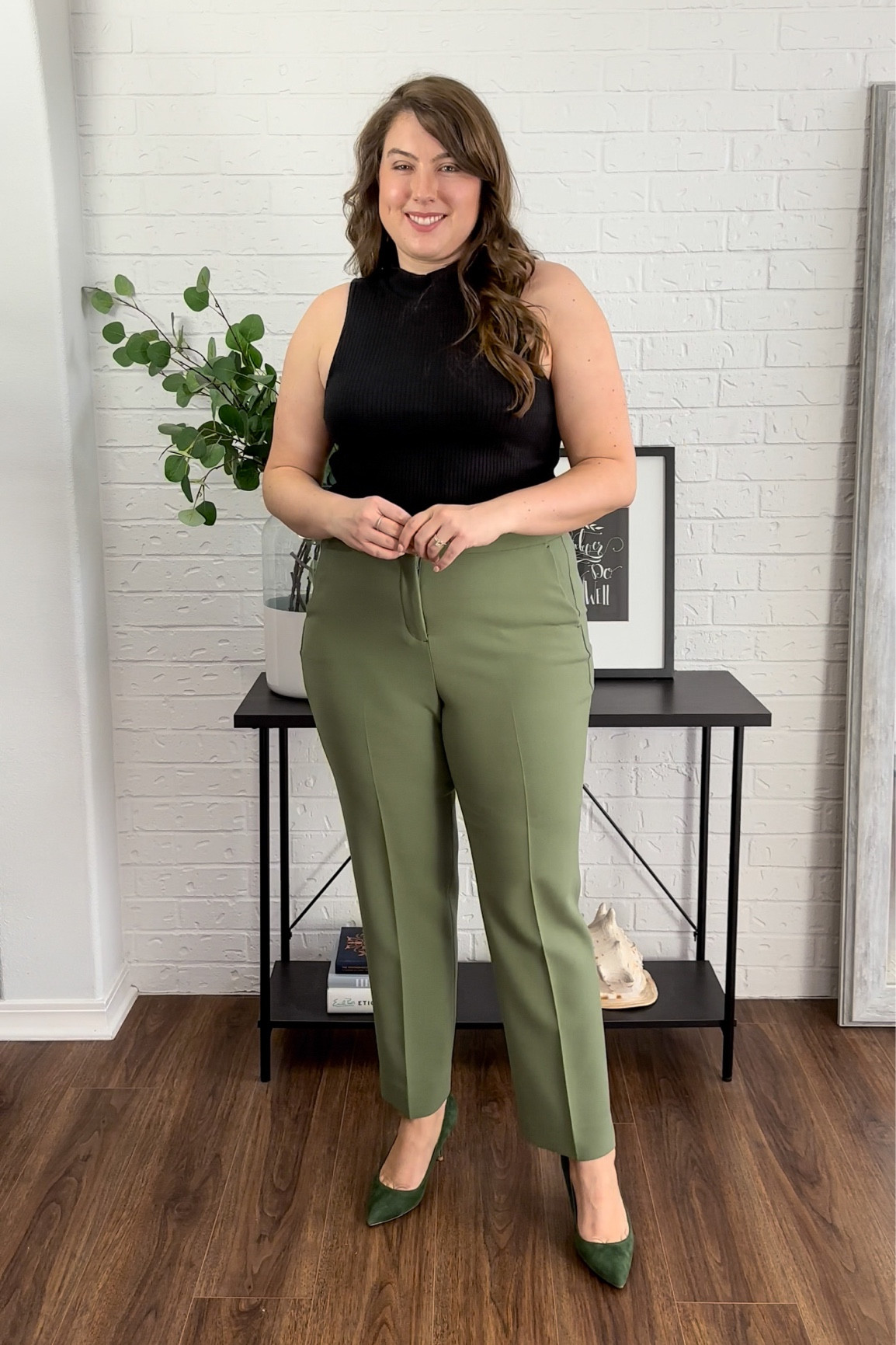 I love this outfit because the fitted black sleeveless turtleneck paired with tailored olive green pants creates a chic, balanced look. The matching green heels tie the ensemble together seamlessly, adding a polished touch.