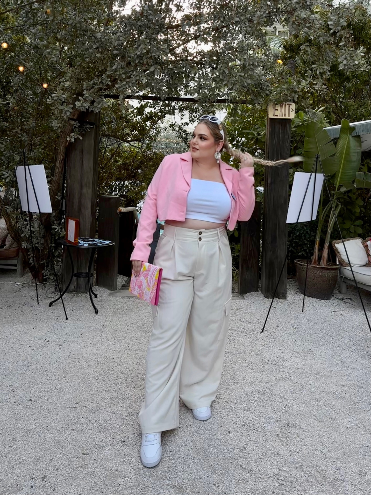 I love how this outfit seamlessly blends chic and comfort, featuring a stylish pink cropped blazer paired with relaxed, high-waisted wide-leg pants. The white crop top and trendy sunglasses add a fresh, youthful touch, while the colorful clutch provides a fun accent.