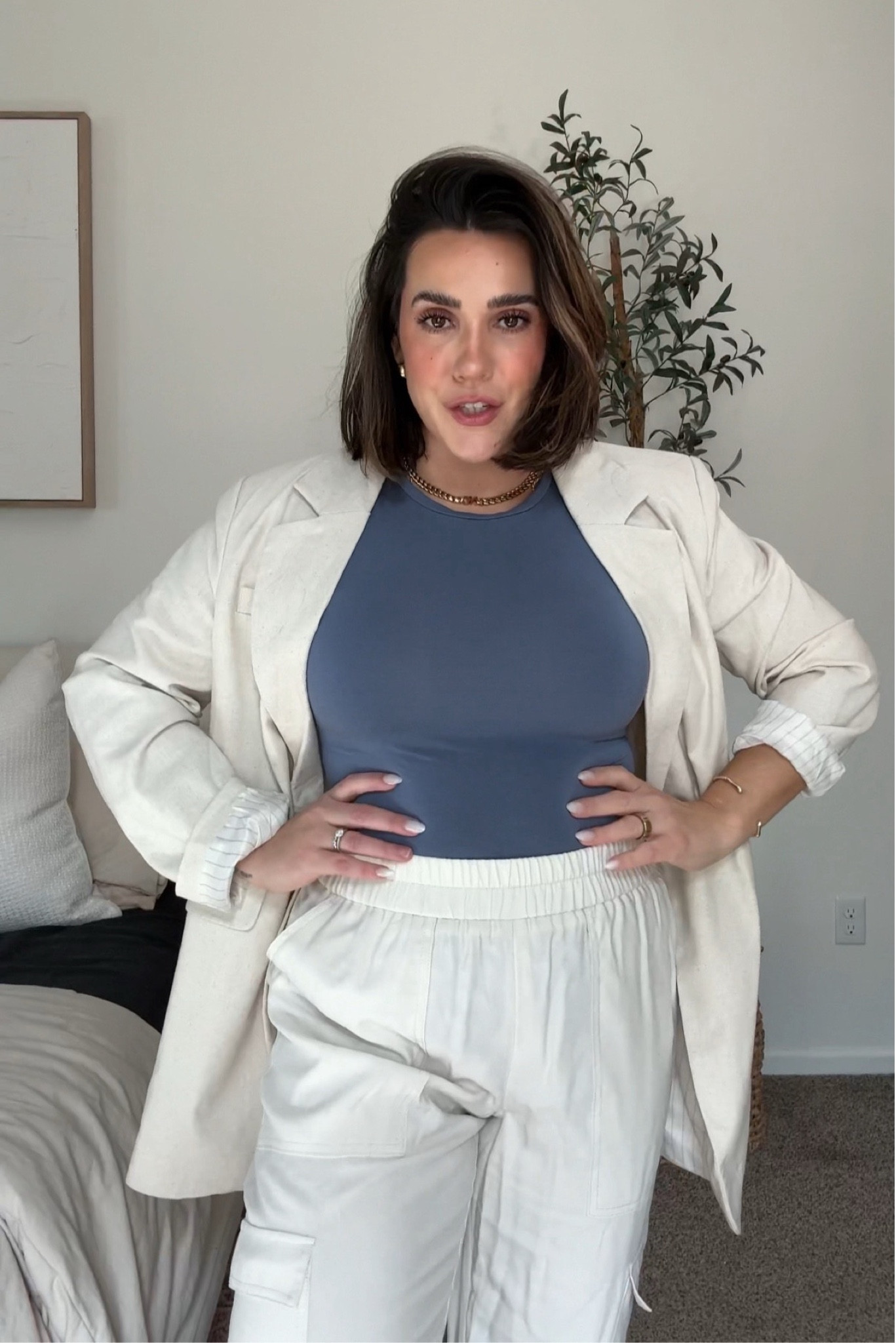 I love how the structured blazer adds sophistication to the casual, comfortable vibe of the tank top and joggers. The outfit strikes a perfect balance between chic and relaxed, making it versatile for various occasions.
