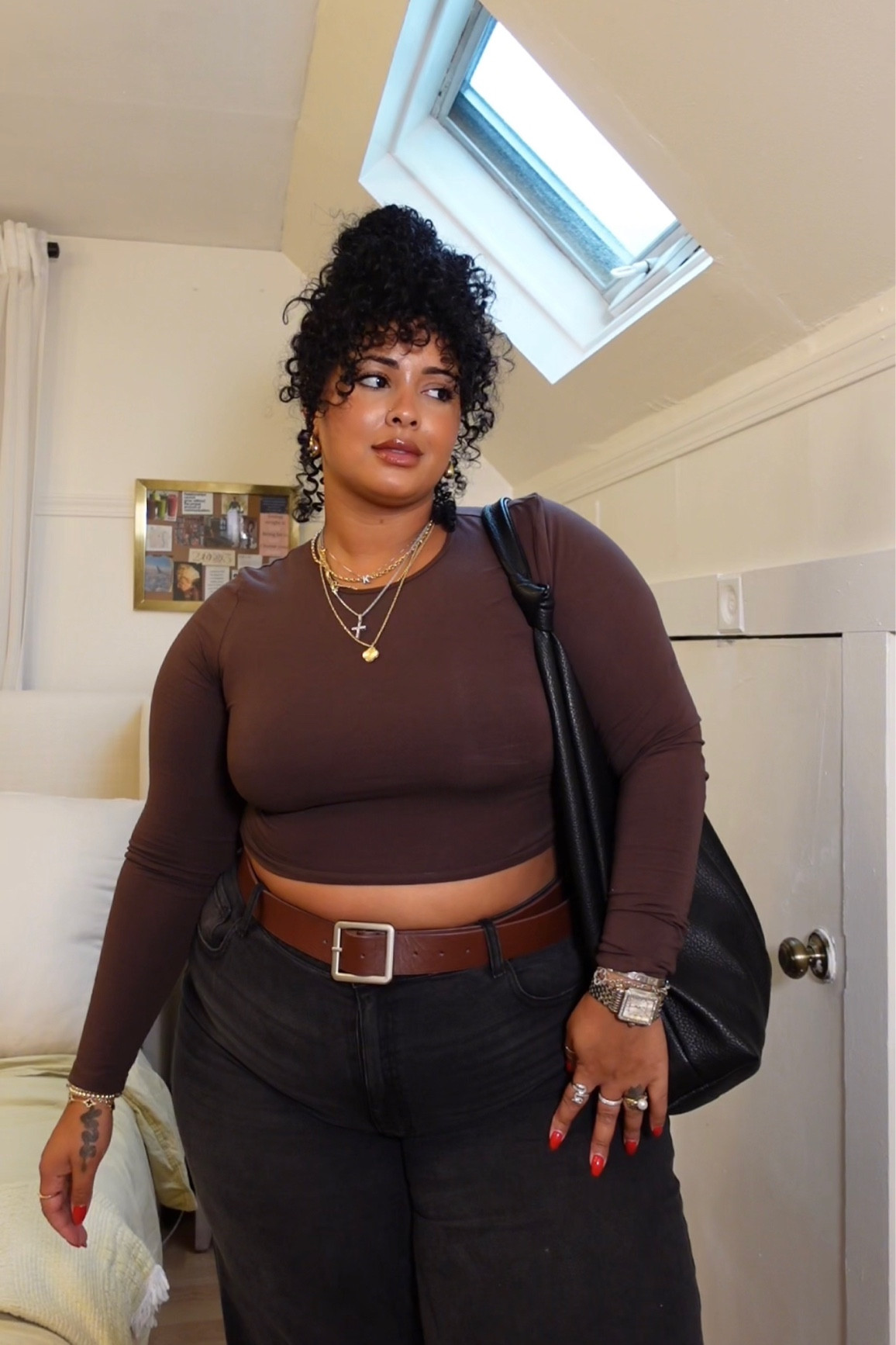 I love how the fitted brown top complements the high-waisted black jeans, creating a sleek and stylish silhouette. The layered necklaces and bold accessories add a touch of glamour, making the outfit stand out effortlessly.
