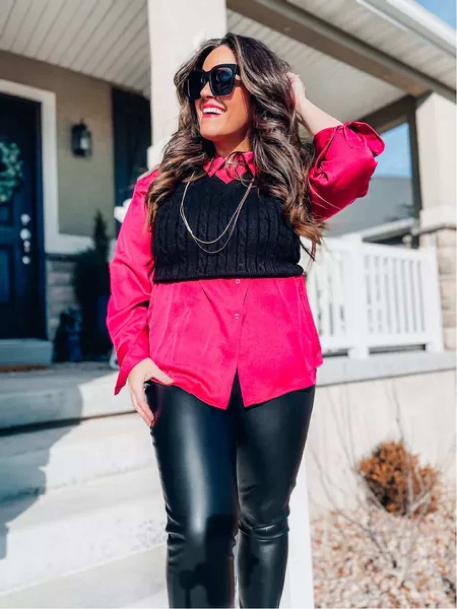 I love how this outfit combines a bold, vibrant red shirt with sleek, black leather pants for an edgy yet sophisticated look. The black knit vest adds texture and contrast, perfectly accessorized with simple yet chic sunglasses and a necklace.