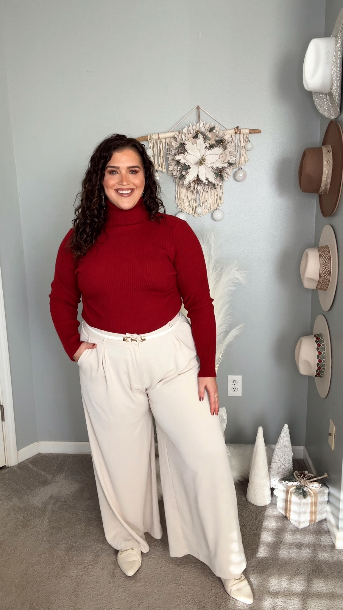 I love how the deep red turtleneck perfectly complements the high-waisted cream pants, creating a sophisticated and flattering silhouette. The wide-leg trousers add an elegant touch, making the outfit both chic and comfortable.
