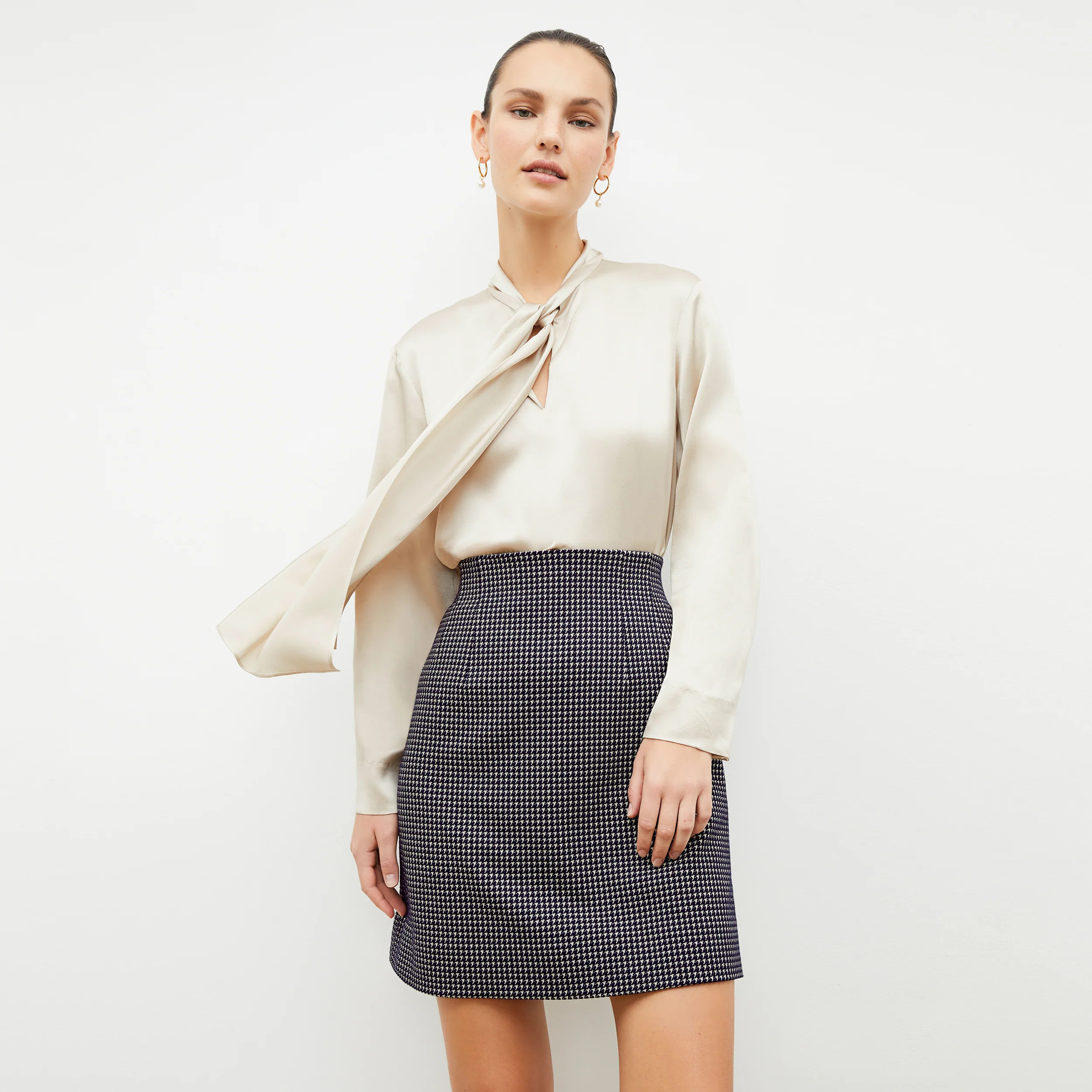 I love how the neutral tones of the top and skirt create a sophisticated and polished look. The tailored fit of the skirt complements the simplicity of the top, making the ensemble both professional and chic.