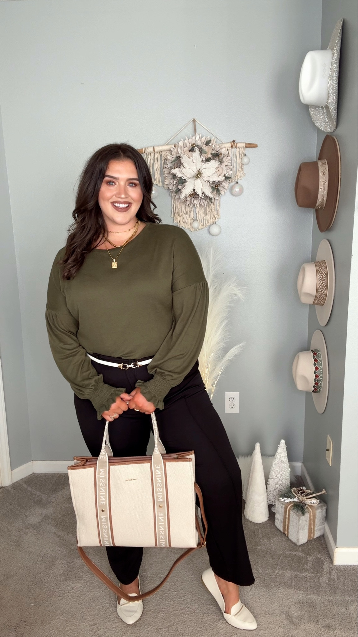 I love how the olive green top complements the black trousers for a sleek, stylish look. The accessories, including the belt and tote bag, add a refined touch, perfectly balancing the outfit.