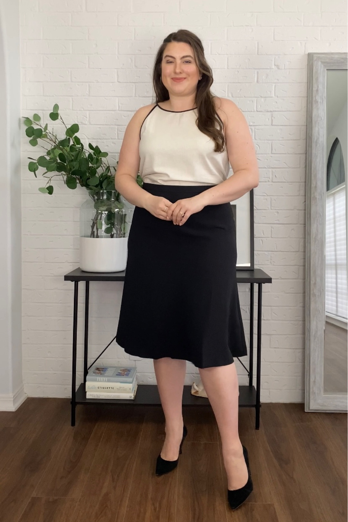 I love this outfit because it’s a chic blend of classic and sophisticated elements, with the black and white pairing creating a timeless look. The fit and flare of the skirt flatters the silhouette, making it perfect for both professional settings and elegant evenings out.