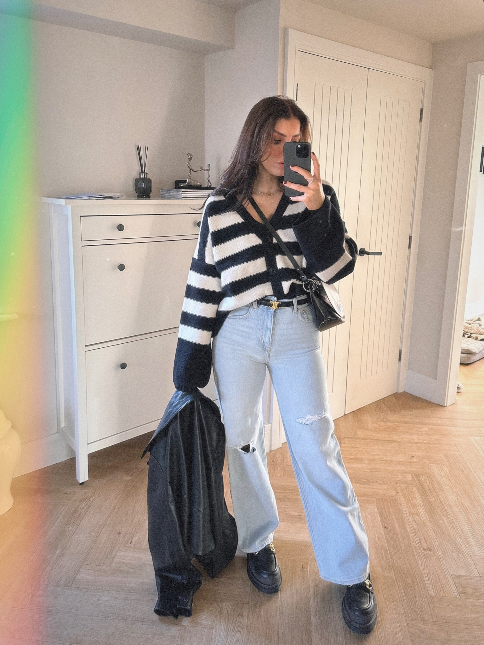 The bold black and white stripes of the top paired with the high-waisted, distressed light-wash jeans offer a classic yet edgy aesthetic. The cinched waist with a sleek belt and the chunky boots amplify the modern, street-style vibe of the ensemble.